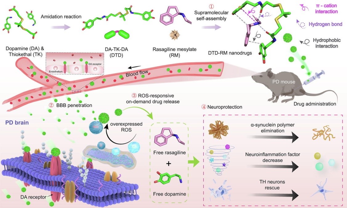 帕金森病(Parkinson’s disease,PD)是一种常见的神经系统变性疾病,我国65岁以上人群PD的患病率大约为2%。临床上表现为静止性震颤、肌强直、运动迟缓和姿势平衡障碍,极大地影响了患者的生活质量。大量研究表明,PD的主要病理特征是由于黑质致密部(SNpc)中错误折叠𝛼-synuclein(α-syn)的积累和多巴胺(DA)能神经元的丢失。此外PD病发时还伴有显著的神经炎性病变和氧化应激损伤。然而,目前仍缺乏有效的治疗策略以挽救DA神经元的死亡。另外,目前临床上治疗PD主要以药物为主,但PD新药开发中最大的瓶颈是小分子药物的选择性差或难以穿过血脑屏障(BBB)。鉴于此,杨立朝教授团队首先合成了ROS响应性DA二聚体,并通过超分子策略将其和甲磺酸雷沙吉兰(RM)自组装构筑形成了无载体纳米药物。研究还发现,经由腹腔注射后,智能纳米药物可特异性穿过BBB靶向脑组织,并分别与内皮细胞和神经元细胞上过表达的DA受体结合,通过DA受体介导的胞吞作用内化进入内皮细胞和神经元细胞;之后在PD内源性ROS的触发下纳米药物迅速解组装并释放DA和RM,已释放的游离DA和RM通过抑制α-syn聚集和神经炎症、增强DA神经元存活实现对PD的三重协同治疗。因此,本团队提出的基于PD微环境响应的无载体分级靶向治疗策略,有望为PD的治疗提供新思路。