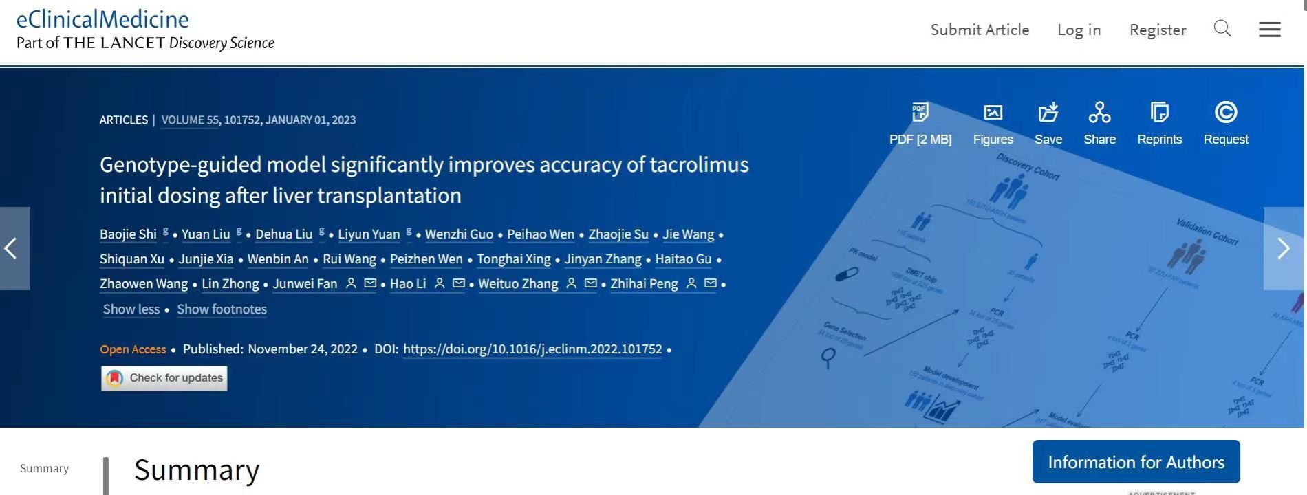 11月24日,厦门大学器官移植研究所彭志海团队在柳叶刀旗下国际权威期刊eClinicalMedicine杂志(IF:17.033)上发表题为“Genotype-guided Model Significantly Improves Accuracy of Tacrolimus Initial Dosing after Liver Transplantation”的最新研究成果。