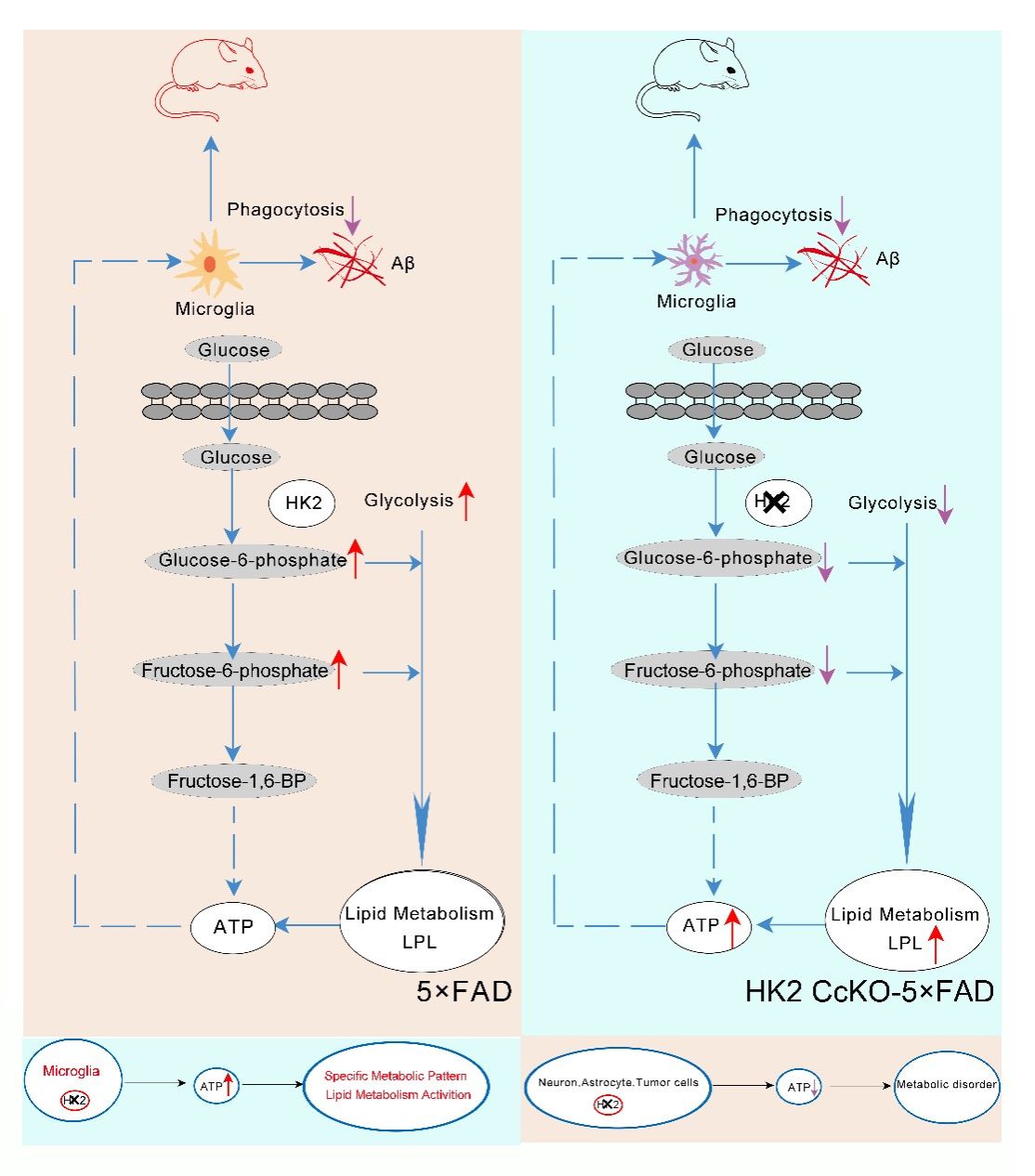 调控机制方面,张杰团队发现HK2的敲除或抑制虽然抑制了小胶质细胞对葡萄糖的利用,但通过上调脂质代谢关键酶lipoprotein lipase (LPL),动员小胶质细胞内的脂质代谢,非常快地提高了细胞内ATP的水平,促进了小胶质细胞的吞噬功能。HK2的两种下游代谢产物,葡萄糖-6-磷酸(G-6-P)和果糖-6-磷酸酯(F-6-P),可逆转这一过程,但1,6-二磷酸果糖不具有这个作用。进一步机制研究发现G-6-P和F-6-P可以通过磷酸戊糖途径调控脂质代谢。这些结果将糖-脂代谢与包括吞噬作用在内的小胶质细胞功能紧密联系起来。该项工作表明短暂、周期性地对小胶质细胞中葡萄糖代谢的抑制可以起到促进小胶质细胞对淀粉样蛋白的吞噬作用。同时研究者还发现这个作用是小胶质细胞所特有的,糖代谢的抑制并不能增加其他类型的脑细胞,如神经元和星形胶质细胞中的ATP生成。