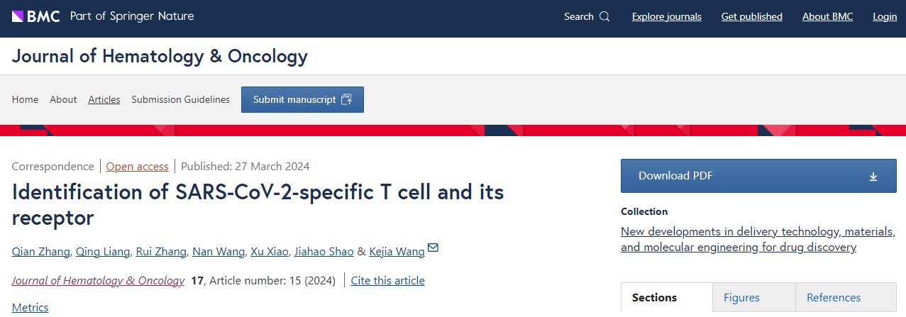2024年3月27日,厦门大学医学院王科嘉团队在血液与肿瘤学Top期刊《Journal of Hematology & Oncology》上发表题为《Identification of SARS-CoV-2-specific T cell and its receptor》的最新研究成果。