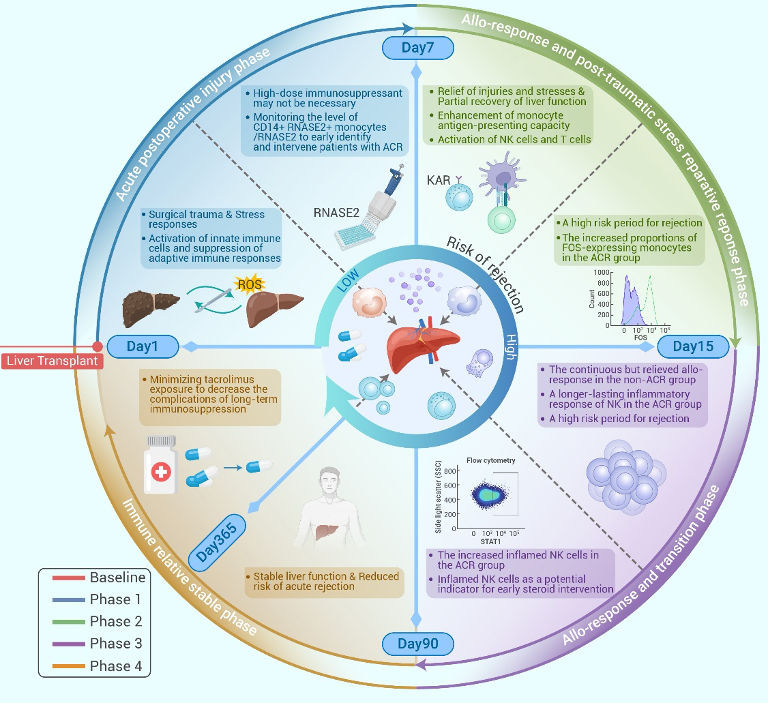 该研究揭示了免疫抑制剂作用下稳定恢复的移植患者术后1年内的免疫应答模式呈现四阶段进程:第一阶段为术后前7天,第二阶段为术后7天至15天,第三阶段为术后15天至90天,第四阶段为术后90天至365天。在此基础上,利用多种组学分析方法初步确定了肝移植术后四分期恢复过程中的特征性转录变化和细胞变化,绘制了肝移植术后免疫稳态重建动态图谱。同时通过对各个时期免疫细胞的变化进行细致分析,识别并验证出多个可在早期识别和干预排斥的分子标记。