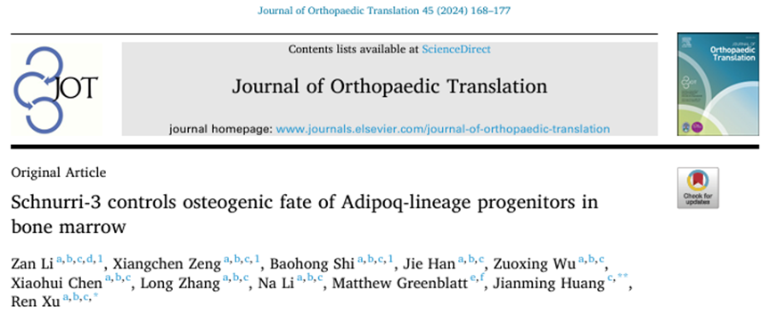 3.“Schnurri-3 controls osteogenic fate of Adipoq-lineage progenitors in bone marrow”发表于高水平期刊《Nature Communications》、《Bone Research》和《Journal of Orthopaedic Translation》。