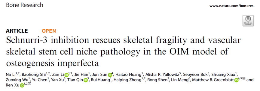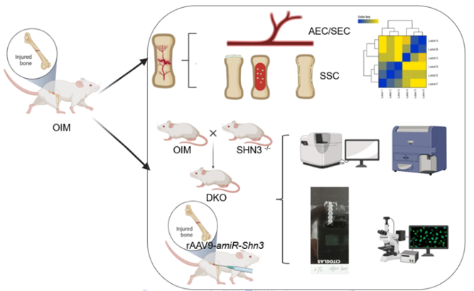 2、在发表于《Bone Research》工作中,研究团队关注骨骼发育中最为典型的一类遗传性罕见病—成骨不全症,患儿极易发生骨折,轻微的碰撞,也会造成严重的骨折,当前在临床上仍然不可治愈,急需新的治疗策略来有效应对。近年来,骨骼干细胞和骨形成特异微环境逐渐成为骨科学研究的核心内容。深度探究成骨不全症所涉及到的“新兴”细胞类群骨骼干细胞(SSC)、骨血管内皮细胞(AEC,SEC)及其相关属性的变化(更新、分化、增殖等),并确定与其关联的细胞分子基础,为未来成骨不全症的精准医学研究和细胞治疗方案打下理论基础,提供新型策略和方向。