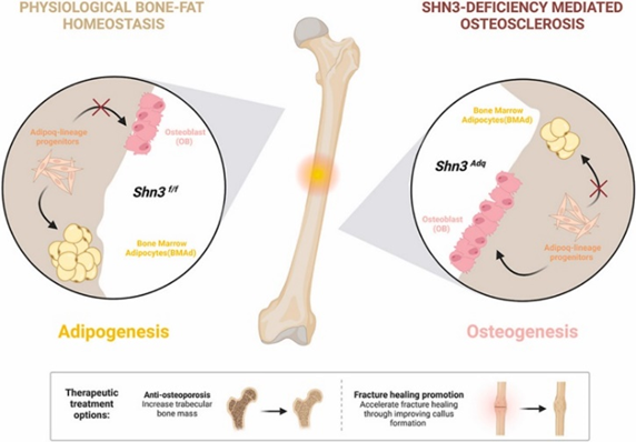 在这项研究中,我们使用单细胞RNA测序(scRNA-seq)分析来证明,与小鼠和人类的其他间充质细胞群体相比,adipoq谱系祖细胞表达更高水平的Shn3。adipoq谱系祖细胞中Shn3的缺失导致体内骨小梁骨量和骨形成显著增加,而不会破坏全身能量代谢和骨骼发育。小鼠谱系示踪和体外功能分析显示,Shn3消融有效地将adipoq谱系祖细胞的命运转变为骨髓的促成骨表型。此外,体内研究表明,在病理条件下,adipoq谱系祖细胞中缺乏Shn3还能促进骨折愈合。综上,研究团队通过靶向骨髓adipoq谱系祖细胞,促进其骨合成代谢潜力,从而为骨质疏松症等相关疾病提供了一种新型治疗策略。