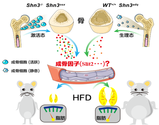 该研究使用了Schnurri-3(SHN3)适配蛋白的高骨量小鼠模型(Shn3-/-小鼠),研究人员将Shn3-/-小鼠饲喂高脂饮食12周后,发现这些小鼠在高脂饮食(HFD)下展现出对饮食诱导肥胖的强大抵抗力,并表现出更好的葡萄糖代谢能力和更高的胰岛素敏感性。研究团队通过基因敲除小鼠模型,组织学染色,高脂饲喂代谢水平监测,RNA-seq,蛋白质组学质谱等一系列实验证实了骨骼中的成骨细胞是这一现象的关键驱动因素。该研究揭示了SHN3基因敲除后,成骨细胞可通过分泌骨源性SLIT2-C,促进白色脂肪细胞棕色化,进而发挥抵抗饮食诱导性肥胖、改善糖代谢的作用。这一发现进一步证实了骨骼不仅仅是支持身体结构的静态器官,更是活跃参与全身能量代谢的内分泌器官。该研究阐明了通过调控骨SHN3-SLIT2轴,不仅可能治疗骨质疏松症,而且有助于改善肥胖相关代谢性疾病。该研究同时针对这两种严重危害人类健康的慢性疾病,对未来开发新型治疗方法提供了重要的理论基础。