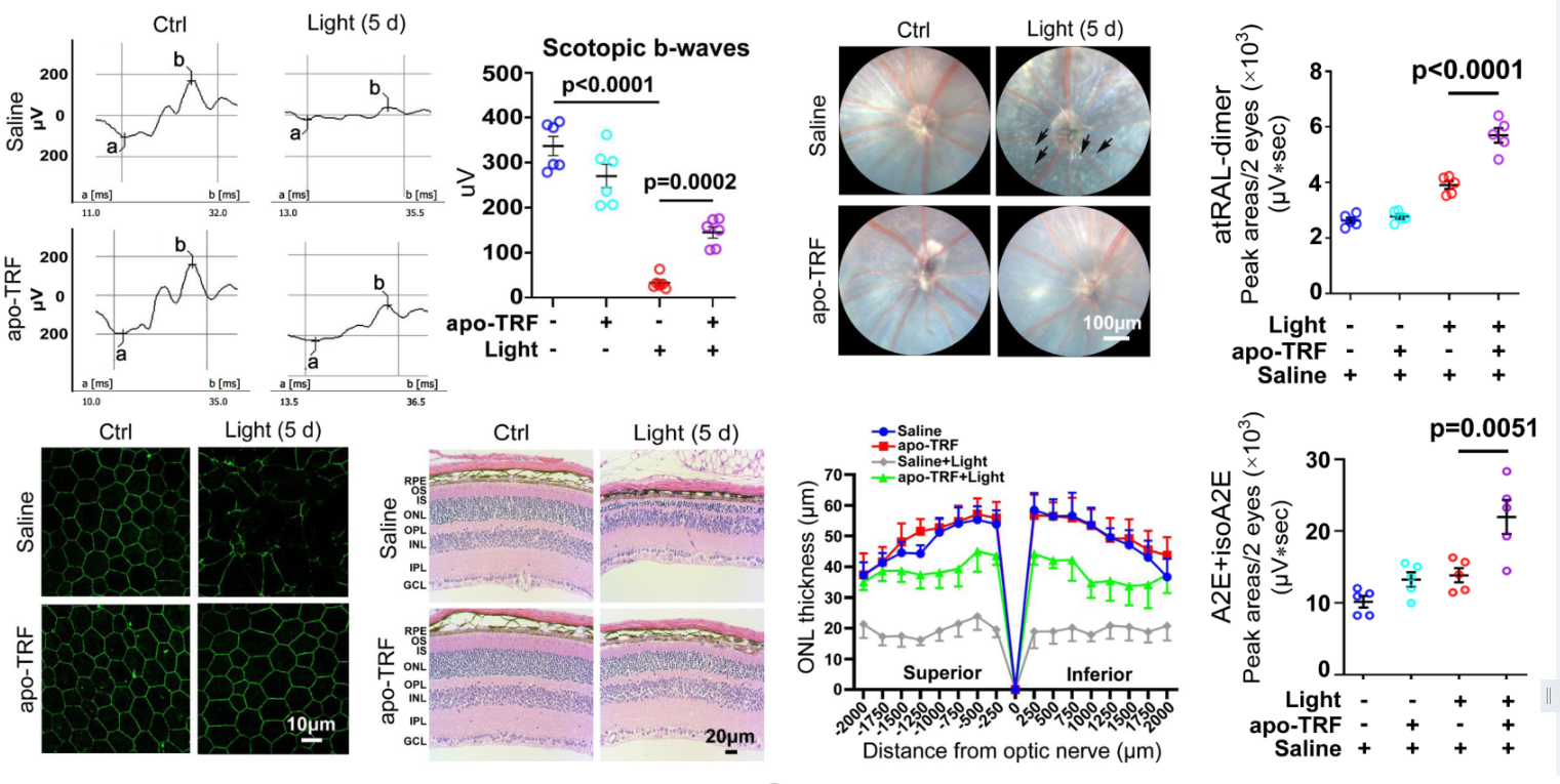 转铁蛋白Transferrin(TRF)是一种铁转运蛋白。人视网膜中TRF含量是肝脏和大脑皮层的6倍多。该研究介绍了TRF的一种新功能,即在碳酸氢根(HCO3─)的辅助下促进atRAL二聚化,其有效地保护了小鼠视网膜免受atRAL聚集诱导的损伤和功能下降,并且阻止了负载atRAL的RPE细胞死亡。“原位”干预atRAL聚集,使其转化为低毒的atRAL二聚体,再通过人们日常生活中的光线裂解atRAL二聚体为无毒的碎片,后者跨膜进入细胞间基质,在新陈代谢中消除,从而达到降低游离atRAL水平的目的。游离atRAL水平的减少,不仅可抑制下游信号的激活,同时也可阻止RPE脂褐素的形成,有望为逆转STGD1和干性AMD这类疾病提供一种全新而更加有效的策略。这是关于一种蛋白质参与视网膜中atRAL缩合反应形成类维生素A二聚体的第一篇报道。TRF可作为治疗atRAL相关视网膜疾病(如STGD1和干性AMD)的一种有前景的候选药物。该研究工作得到了国家自然科学基金、广东省自然科学基金、深圳市自然科学基金等资助。