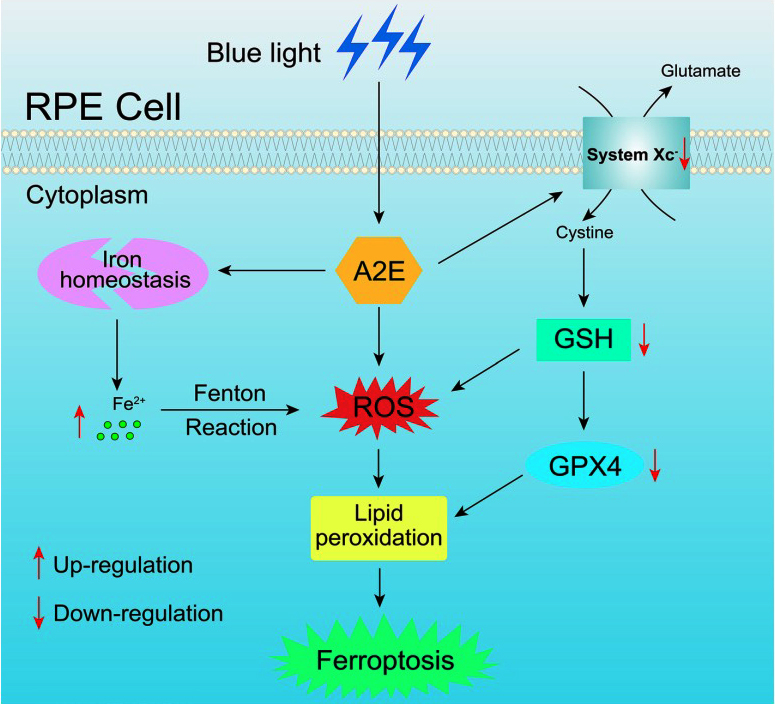 A2E是RPE细胞内脂褐素的主要成分。该研究创新性地发现A2E暴露于蓝光促进了RPE细胞铁死亡:破坏谷氨酸/胱氨酸转运体系统导致谷胱甘肽(GSH)水平显著降低,GSH耗竭使谷胱甘肽过氧化物酶4(GPX4)失活,产生大量活性氧(ROS),进而引发脂质过氧化,最终诱导细胞发生铁死亡;此外,干扰铁稳态使细胞内Fe2+水平升高,然后通过Fenton反应激发大量ROS产生,从而触发铁死亡。动物实验显示抑制铁死亡能够有效地减轻脂褐素蓝光毒性引起的视网膜功能下降和视网膜退化现象。该研究工作得到了国家自然科学基金、广东省自然科学基金和深圳市自然科学基金项目的资助。