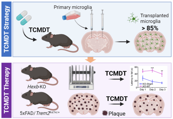 该研究基于CSF1R抑制剂PLX3397,设计“三周期小胶质细胞清除移植法(TCMDT)”,通过三轮精准清除内源性小胶质细胞,为原代小胶质细胞移植创造理想窗口。该策略实现了高达85%的移植效率,移植细胞在形态、转录谱、环境监测及免疫应答等方面均高度还原内源小胶质细胞特性。该团队进一步在阿尔茨海默病Trem2 R47H突变模型及溶酶体贮积症Hexb缺失模型中验证了TCMDT的治疗效果,观察到Aβ清除能力增强、神经炎症改善及运动功能恢复等显著改变,充分体现其在神经退行性疾病治疗中的潜力。