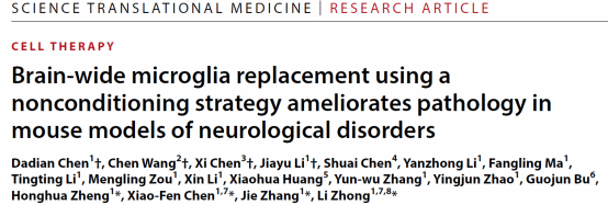 近日,医学院神经科学研究所钟力副教授、张杰教授团队联合陈小芬教授、郑红花教授等,在小胶质细胞替代治疗技术方面取得重要突破,提出一种无需放化疗预处理即可实现全脑高效替代的小胶质细胞移植方案,为阿尔茨海默病等多种神经系统疾病的治疗提供了全新思路。相关研究成果“Brain-wide microglia replacement using a nonconditioning strategy ameliorates pathology in mouse models of neurological disorders”于4月30日发表在国际权威期刊Science Translational Medicine 上。