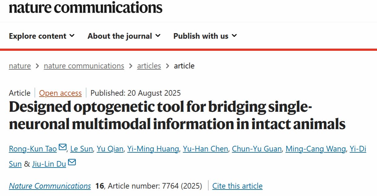 近日,厦门大学医学院陶荣坤副教授课题组与中国科学院脑科学与智能技术卓越创新中心杜久林团队合作,在神经元多模态标记技术领域取得重要研究进展。研究成果“Designed optogenetic tool for bridging single-neuronal multimodal information in intact animals”发表于Nature Communications杂志。