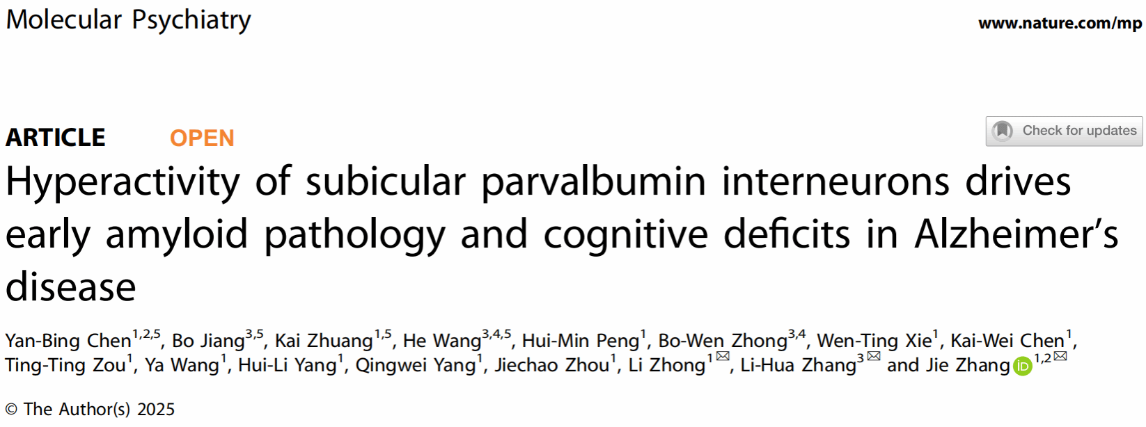 近日,厦门大学医学院神经科学研究所张杰教授、钟力副教授联合中国科学院大连化学物理研究所张丽华研究员团队在《Molecular Psychiatry》期刊发表研究论文“Hyperactivity of subicular parvalbumin interneurons drives early amyloid pathology and cognitive deficits in Alzheimer’s disease”。研究揭示了海马下托区PV中间神经元(parvalbumin interneurons, PV-INs)的过度活跃在AD早期发挥关键作用,并发现靶向抑制下托PV-INs的过度活动不仅局部改善病理,还能缓解全脑范围内的淀粉样β蛋白(Aβ)沉积,为AD早期干预提供了新的切入点。