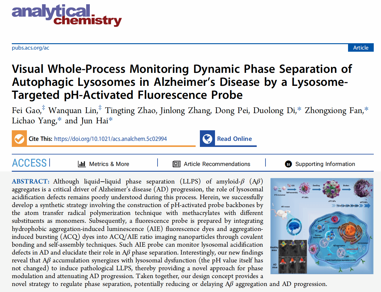 阿尔茨海默病(AD)已成为全球威胁老年人健康的重大神经退行性疾病之一,早期诊断是目前临床防治AD的重要手段。由于AD病理机制十分复杂,其早期诊断仍面临诸多挑战。近年来,溶酶体功能障碍与蛋白质异常相分离在AD病理进展中的作用引起研究者们的广泛关注。液-液相分离(LLPS)被认为是异常蛋白聚集的重要初始事件,而自噬-溶酶体体系的酸化障碍是推动这一过程的关键环节。然而,如何在活细胞内精准、实时、原位监测溶酶体pH动态变化及相分离之间作用机制,成为制约AD早期诊断技术的难点。