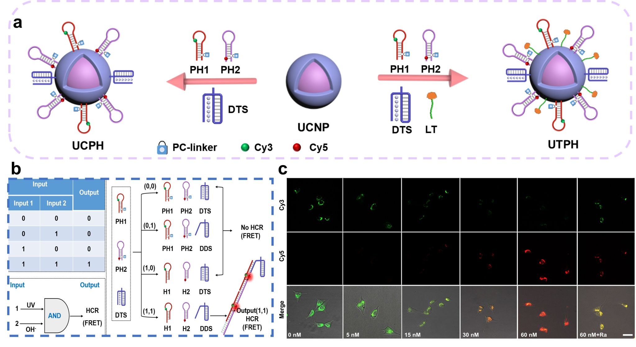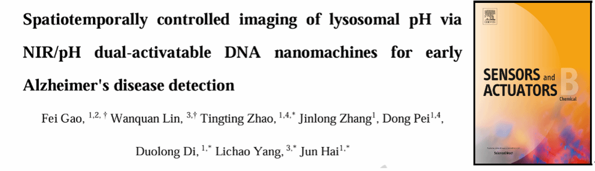 近日,厦门大学医学院杨立朝教授团队联合中国科学院兰州化学物理研究所海军研究员团队在Sensors and Actuators: B. Chemical1和Analytical Chemistry2连续发文,开发了一种近红外光(NIR)/pH双重激活DNA纳米探针(UTPH),首次实现对AD病理过程中溶酶体pH动态变化的实时、原位成像分析,该技术具有高度模块化和可编程性,通过调整DNA序列中的CGC比例,可精细调控探针对溶酶体pH的敏感性范围;通过替换靶向配体,该技术可扩展应用于其它细胞器如线粒体、细胞核的动态精准监测。研究结果为AD等多种神经退行性疾病的早期诊断提供了强大而通用的分子工具,也为在亚细胞水平探索疾病机制开辟了崭新途径。