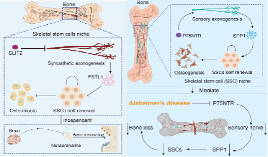 该系列研究首次在骨骼干细胞(SSC)微环境中提出双重神经生态位新概念:一方面,感觉神经通过分泌SPP1对SSC发挥正向调控作用,并揭示阿尔茨海默病中感觉神经退化可导致p75NTR-SPP1轴受损,是AD患者骨质减少的重要机制之一;另一方面,研究发现交感神经通过分泌FSTL1抑制SSC的成骨与自我更新,打破了以往交感神经仅依赖去甲肾上腺素抑制骨形成的传统认知,提出了SLIT2-FSTL1 轴在骨骼干细胞微环境中的负向调节作用。这一“正负调控”的发现不仅拓展了骨-神经互作的研究边界,也为解释神经系统疾病与骨代谢紊乱之间的联系提供了新的理论框架。