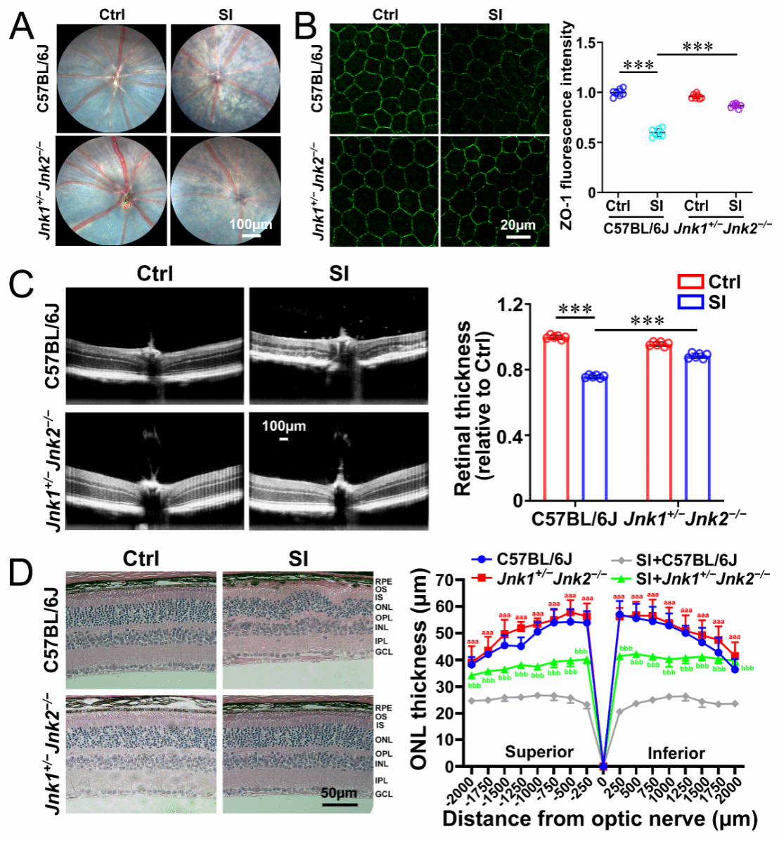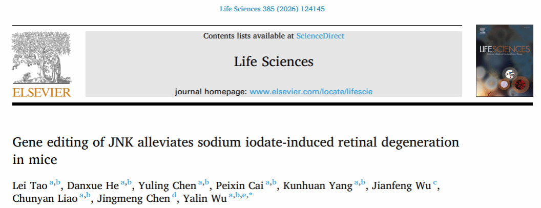 12月份,吴亚林教授团队的另一项成果以“Gene editing of JNK alleviates sodium iodate-induced retinal degeneration in mice”为题,发表于Life Sciences杂志。该研究揭示了c-Jun氨基末端激酶(JNK)基因编辑可有效地缓解碘酸钠诱导的视网膜损伤,有望为干性AMD开辟一条极具前景的治疗路径。该论文的第一作者为博士研究生陶磊。