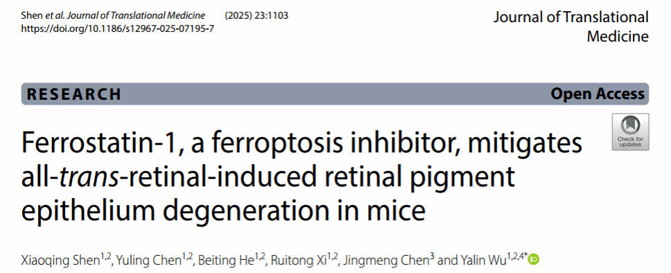 10月份,该团队的另一项成果以“Ferrostatin-1, a ferroptosis inhibitor, mitigates all-trans-retinal-induced retinal pigment epithelium degeneration in mice” 为题,发表于Journal of Translational Medicine杂志。该研究揭示了铁死亡是萎缩型视网膜黄斑变性中视网膜色素上皮(RPE)损伤的核心驱动机制,使用Fer-1抑制铁死亡可提高RPE细胞存活率,从而阻止STGD1和干性AMD中光感受器的继发变性。该论文的第一作者为硕士研究生谌小清。