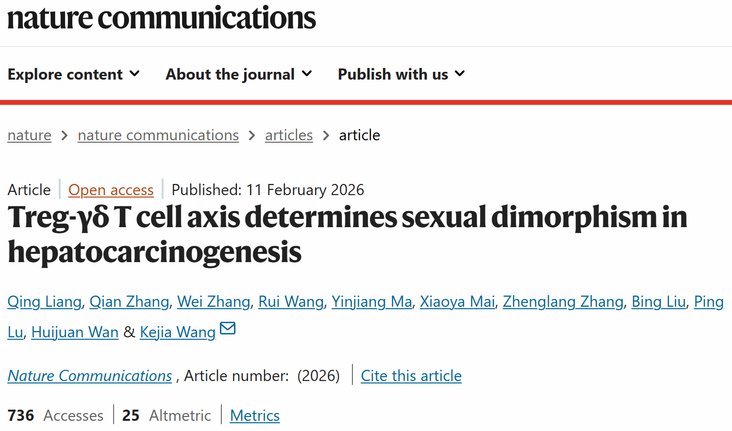 近日,厦门大学医学院王科嘉团队在Nature Communications杂志发表题为Treg-γδ T cell axis determines sexual dimorphism in hepatocarcinogenesis的最新研究成果。