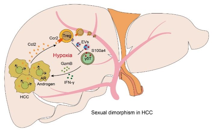 肝癌属于全世界范围内常见的恶性肿瘤,其发病率和死亡率存在明显的性别差异。目前研究主要聚焦在性激素直接作用,而免疫微环境是否参与肝癌性别差异的调控过程尚不清楚。王科嘉团队发现,肝癌组织中调节性T细胞(Treg)含量在男性中显著高于女性,证实雄激素可激活肝癌细胞中NFκB信号通路,促使NFκB与Ccl2启动子区域的结合,从而增强Ccl2的分泌,并通过Ccl2-Ccr2轴特异性招募Treg在肿瘤组织中富集,这是导致Treg存在两性差异的主要原因。此外,研究还发现肿瘤内部的低氧环境可诱导Treg细胞分泌含有S100a4蛋白胞外囊泡(EV),囊泡可跨细胞作用γδ T细胞(而非CD8+ T细胞),而S100a4发挥转录共抑制因子角色,通过表观遗传方式抑制γδ T细胞的肿瘤免疫监视功能。研究结果表明,肝癌中Treg细胞的性别差异与雄激素依赖性的Ccl2分泌能力有关,这种机制通过抑制γδ T细胞的抗肿瘤活性实现免疫逃逸。该研究还强调,γδ T工程化细胞有望实现更为高效免疫细胞治疗策略治疗肝癌。