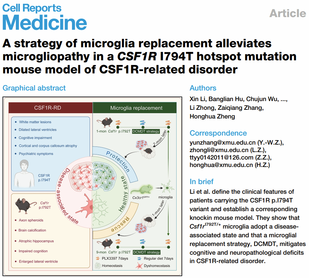 近日,厦门大学医学院神经科学研究所郑红花、钟力、张云武团队与首都医科大学附属天坛医院张在强教授合作的研究成果“A strategy of microglia replacement alleviates microgliopathy in a CSF1R I794T hotspot mutation mouse model of CSF1R-related disorder”在国际顶尖期刊Cell Reports Medicine在线发表。