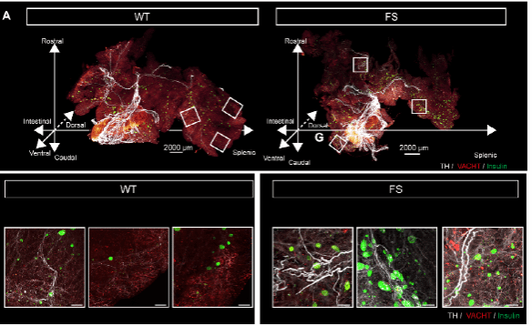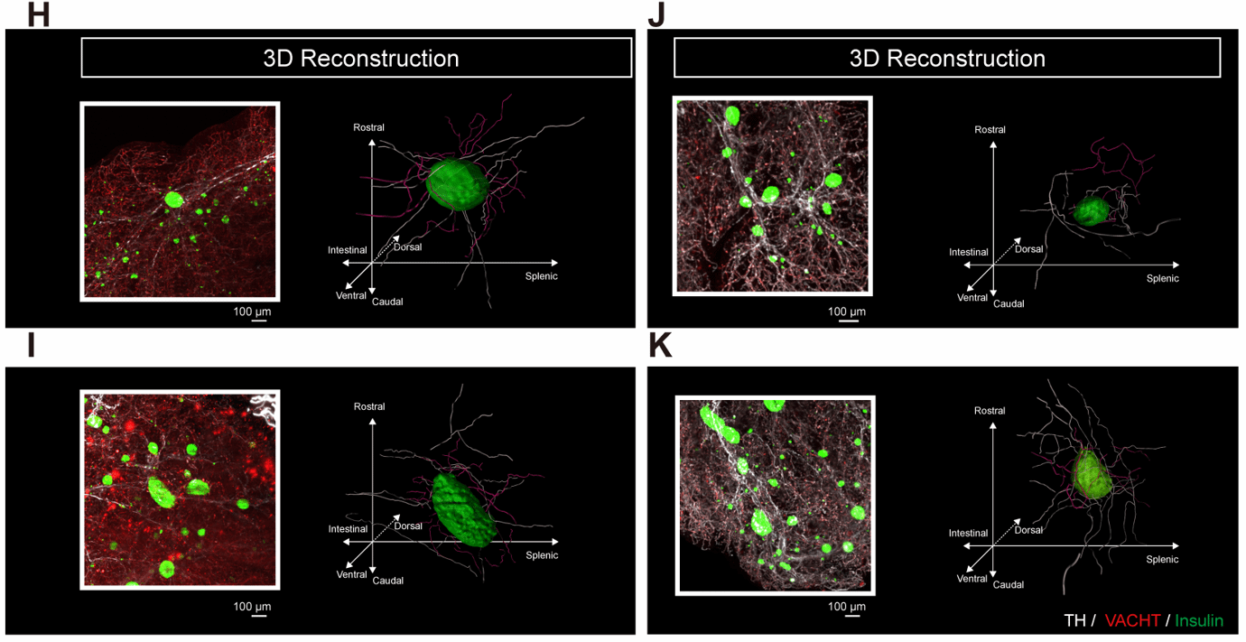 研究团队使用组织透明化和三维免疫荧光成像技术,将上述中枢变化与外周胰腺神经调控联系起来。展示了慢性压力应激条件下胰腺神经支配网络重塑现象:胰岛周围交感神经纤维优势,而副交感神经纤维劣势,呈现这一自主神经失衡状态。进一步分析显示,这种神经重塑不仅存在于胰腺实质,也可见于胰岛组织中,提示慢性压力应激可通过中枢调控改变胰腺局部神经微环境,进而影响胰岛内分泌功能和血糖稳态。