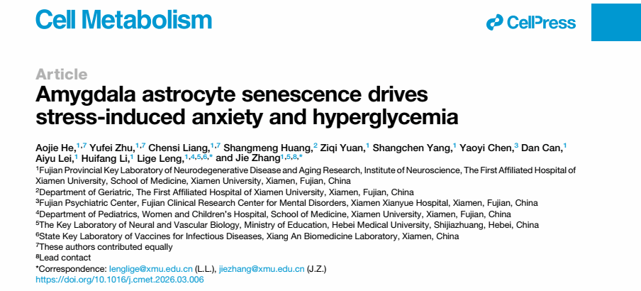 2026年4月3日,厦门大学医学院张杰教授和冷历歌教授团队在国际知名杂志,Cell旗下子刊Cell Metabolism(IF:30.9)发表题为“Amygdala Astrocyte Senescence Drives Stress-Induced Anxiety and Hyperglycemia”研究论文,揭示了慢性压力应激通过诱导杏仁核星形胶质细胞衰老,破坏“星形胶质细胞-神经元丝氨酸穿梭”并进一步重塑胰腺交感/副交感神经支配,从而导致焦虑样行为和高血糖发生的机制。这一研究为理解应激压力与代谢异常共病提供了新的理论框架,也为相关疾病干预提供了新的潜在靶点。