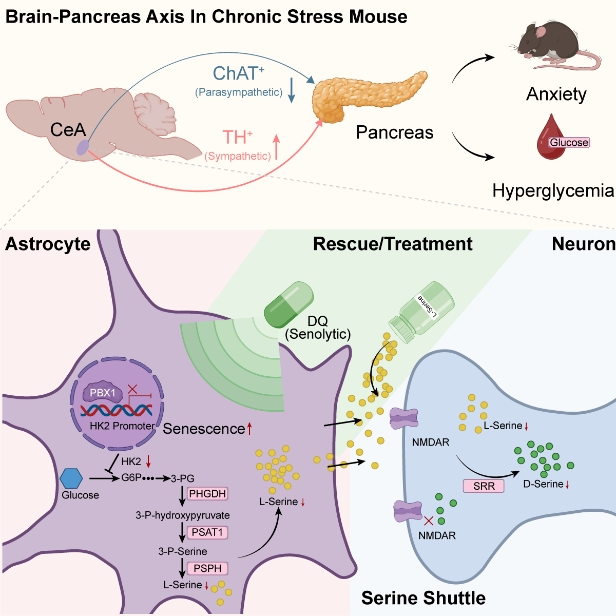 更重要的是,该研究发现这一病理过程具有可逆性。无论是补充L-serine,还是通过清除衰老细胞,均可显著改善慢性压力应激小鼠的焦虑样行为,并纠正葡萄糖耐量异常、胰岛素抵抗及血糖升高等代谢表型。同时,这些干预还可部分恢复胰腺交感/副交感神经支配平衡,提示靶向“星形胶质细胞衰老-丝氨酸代谢紊乱-神经元功能和长程投射异常-自主神经重塑”这一病理轴,可能成为干预应激相关情绪障碍和代谢异常的新策略。