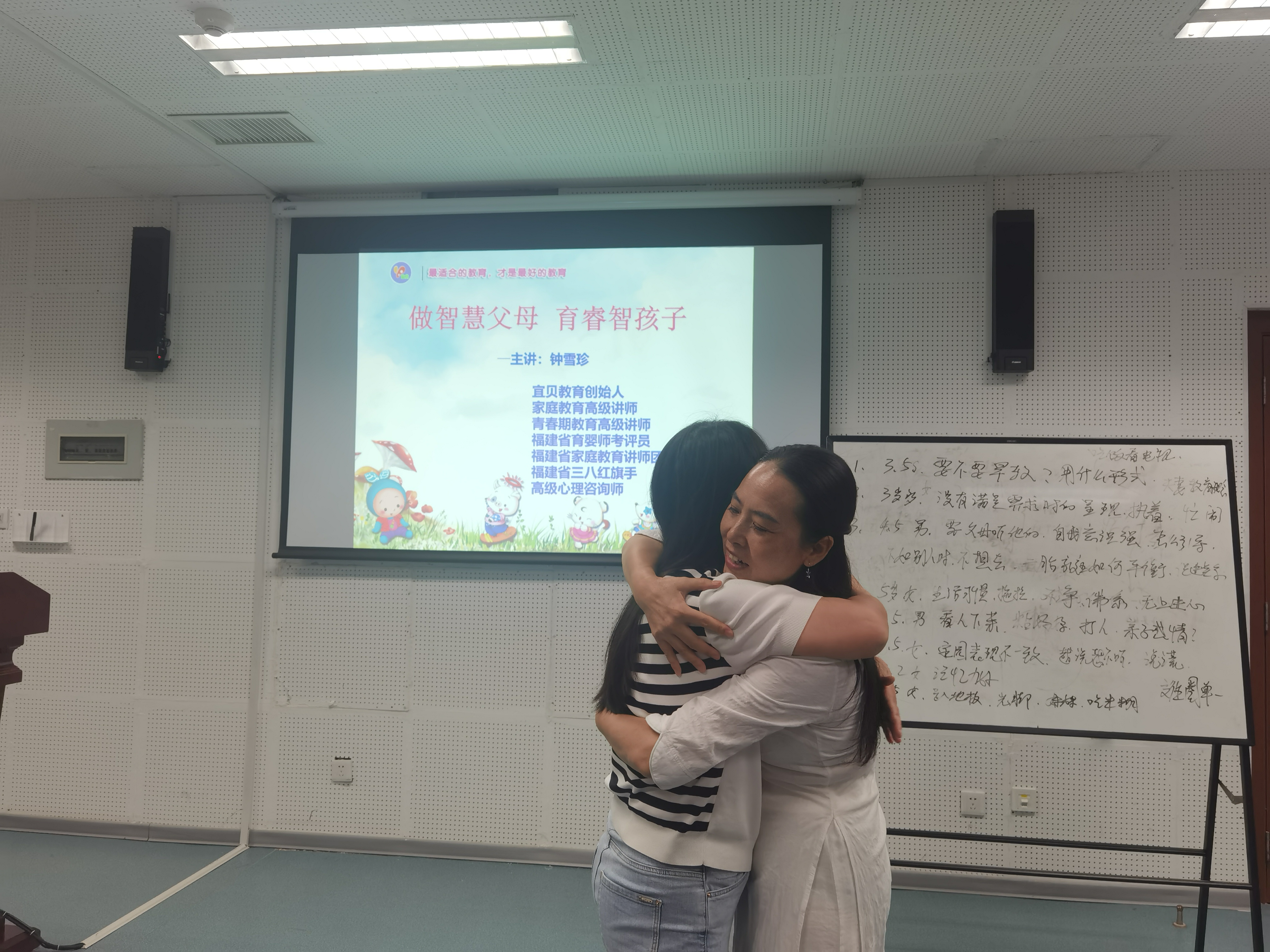 讲座开始前钟老师与各位老师进行了亲密的互动和沟通,与大家一起做游戏活跃气氛,在游戏中拉近和彼此之间的距离,有欢笑声,更有热烈的掌声。在轻松的氛围中,钟老师收集了在场老师们生活中关于育儿的实际问题并一一解答,问题涵盖亲子教育、儿童行为引导、儿童交友、二胎家庭等多方面。通过理论结合实际,钟老师分析了幼儿常见的心理状态及其成因,帮助大家更全面地了解到学龄前儿童的心理发展特征。老师们也将自己在育儿方面的困惑向钟老师分享,钟老师也给予大家详细的回答与建议。钟老师强调,通过日常与孩子拥抱传达爱,并教会大家正确的拥抱方式;同时还需要理解和接纳孩子成长过程中的变化,始终要用爱来呵护孩子的成长,并适时的调整自己的角色和心态。我们父母唯有以“不变应万变”,方能有所改善,与孩子们共同成长。