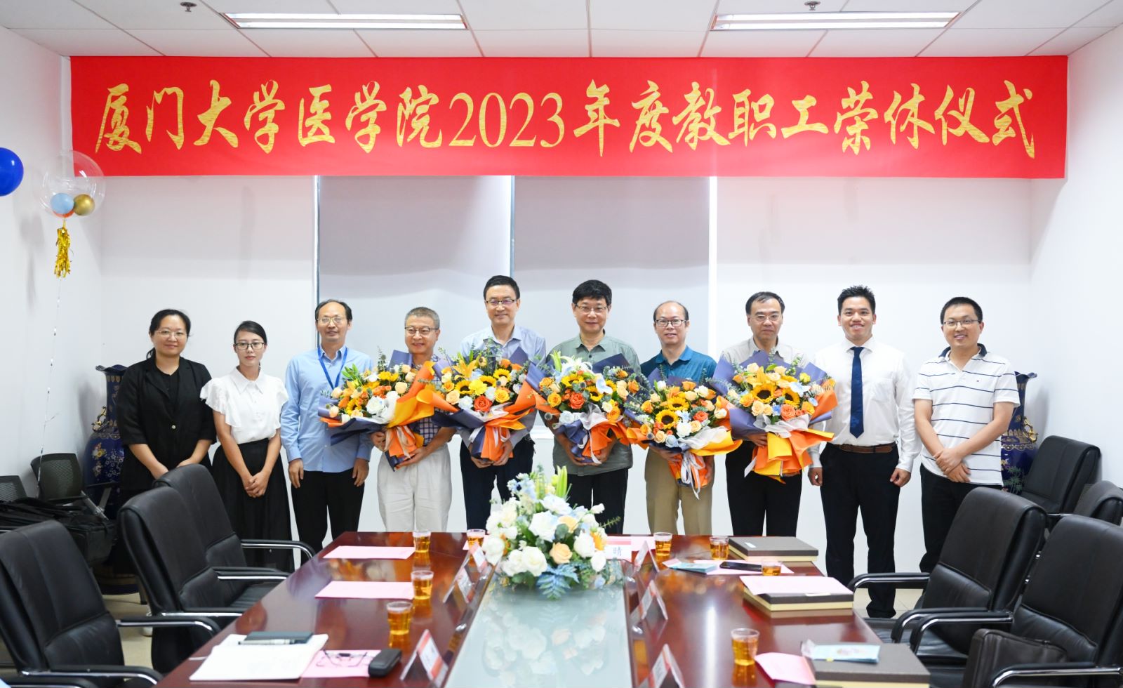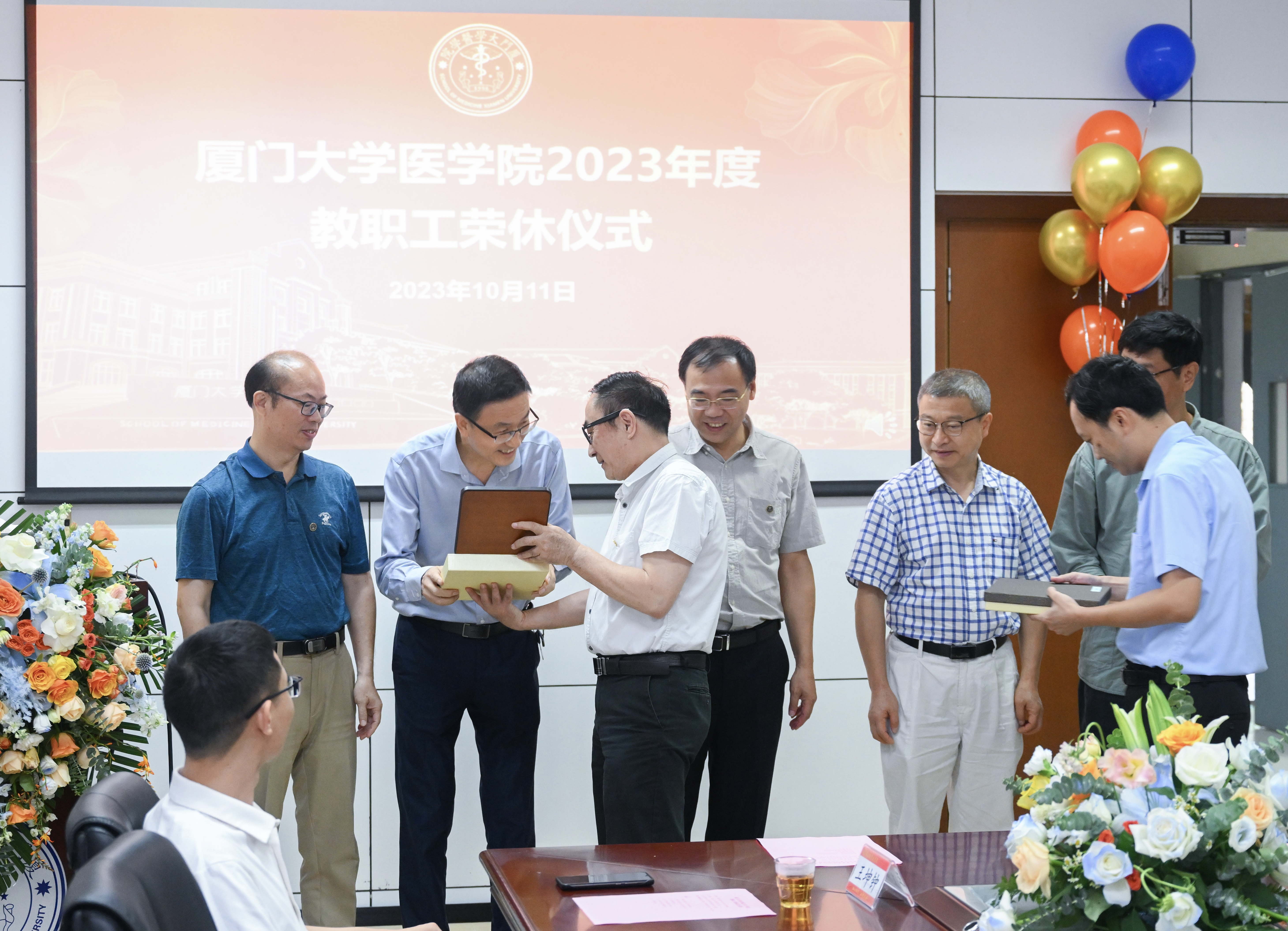 最后,青年教师代表为五位荣休教师献上寓意美好和祝愿的鲜花并合影留念。学院衷心祝愿每位荣休教师都拥有幸福快乐的退休生活,厦门大学医学院永远是您的家!