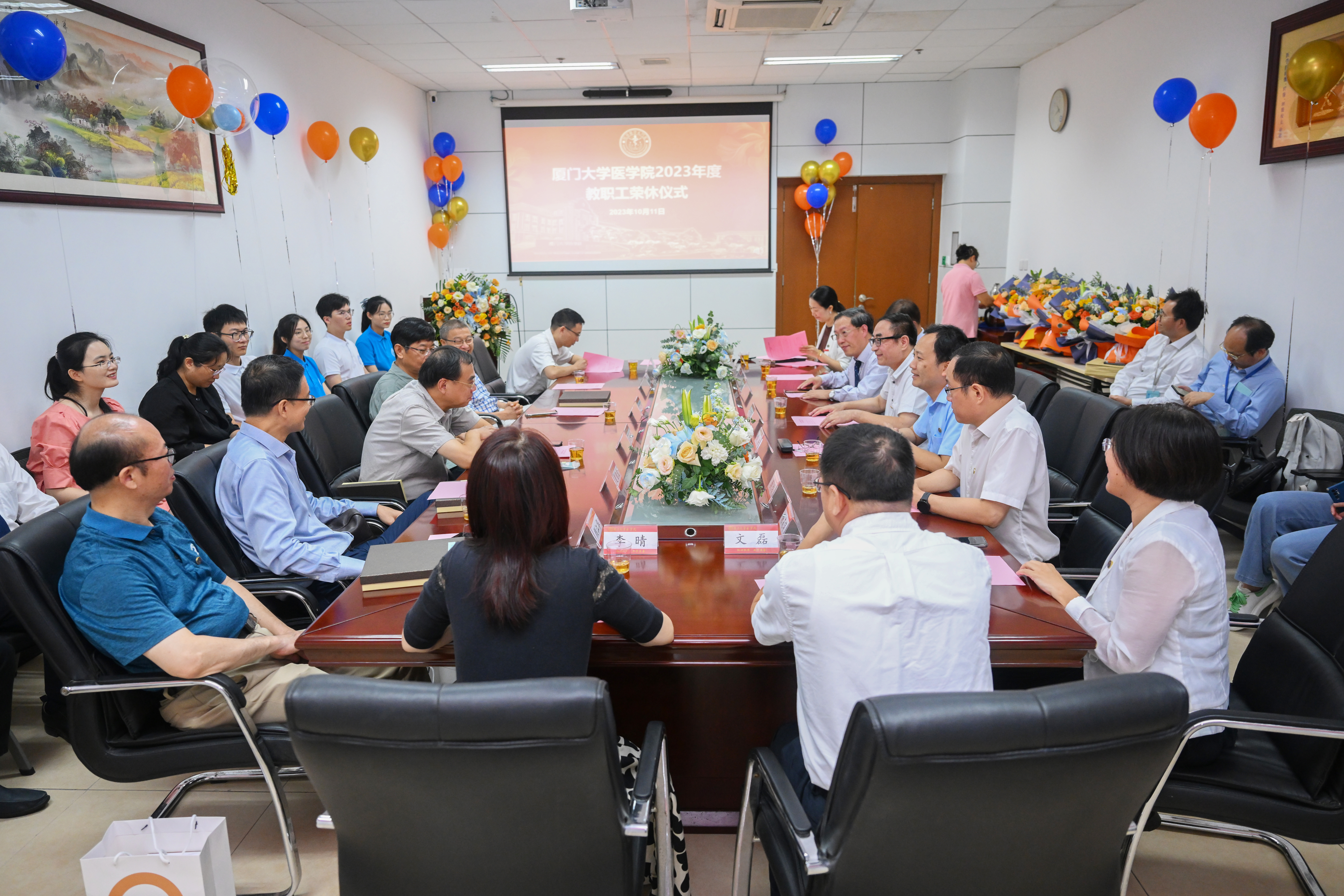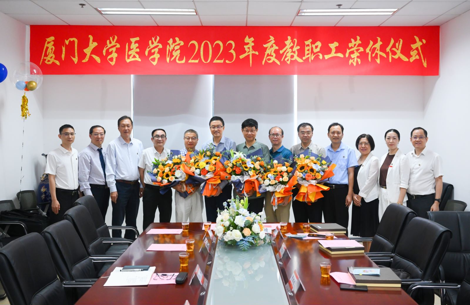 金秋十月,天高云淡。10月11日上午,恰逢建院27周年之际,厦门大学医学院在成义楼105会议室举办2023年度教职工荣休仪式。荣休教师代表、医学院原副院长、中医系王彦晖老师,眼科研究所陈永雄老师,中医系夏智波老师,抗癌研究中心颜江华老师,医学院副院长、中医系钱林超老师与学院党政领导,师生代表欢聚一堂,共同见证这一温馨时刻。荣休仪式由学院党委副书记辛晓丹主持。