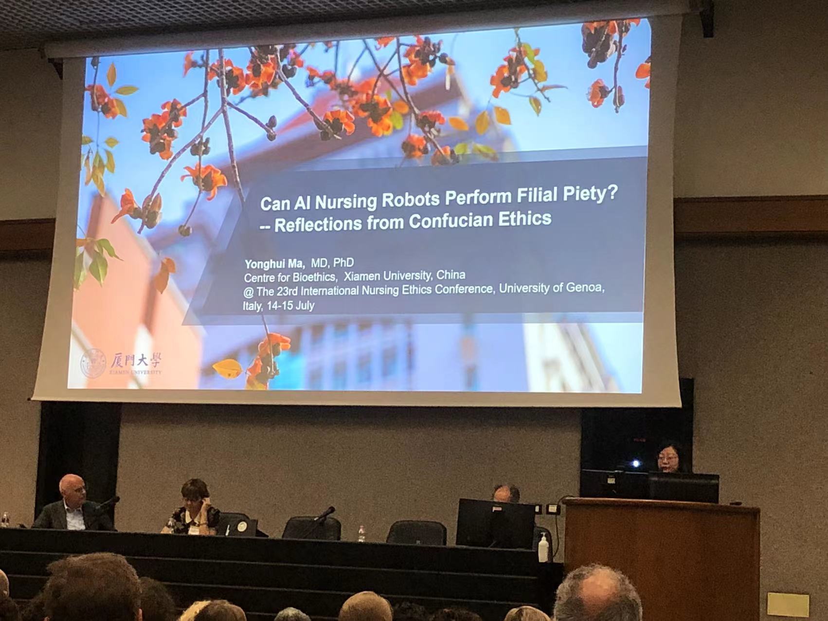 2023年7月13-15日,第23届国际护理伦理学术大会暨护理伦理杂志创刊30周年大会在意大利城市热那亚隆重举办,来自全球近30个国家140多名代表参加了本次大会。大会共设12场主题报告和88场分会报告,我院马永慧副教授受邀做大会主题报告Can AI Nursing Robots Perform Filial Piety? Reflections from Confucian Ethics(AI护理机器人可以行孝吗?--儒家伦理学的反思)。马永慧作为此次大会唯一来自中国的代表,展现了中国学者良好的学术功底和国际视野,报告获得在场代表的一致好评,并获得大会精心准备的热那亚本土艺术家的精美画作作为纪念。
