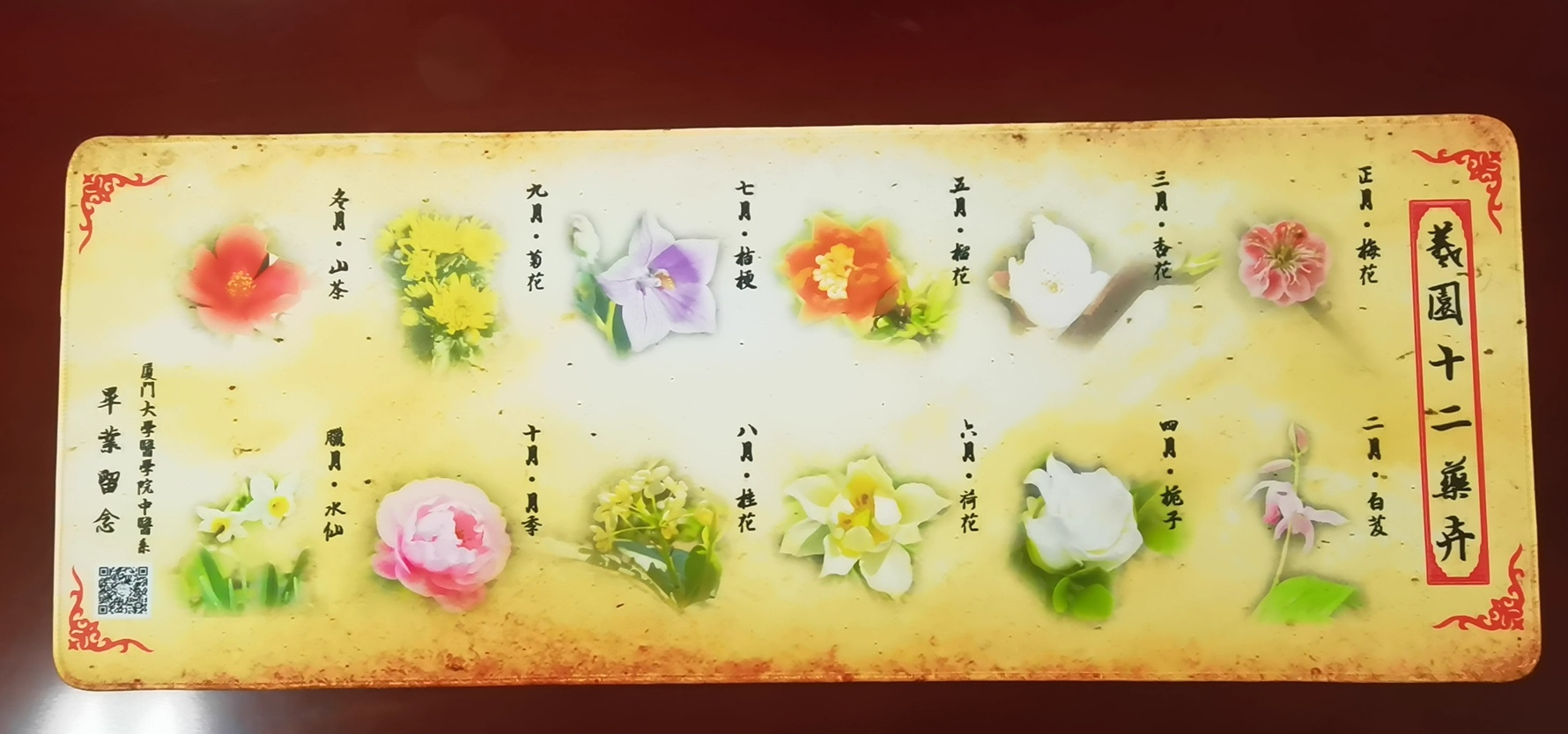 药用花卉是指医学上用于防病、治病的花卉植物,生活中常见的玫瑰、月季、芍药、栀子、百合、桂花等不仅美化着人们的生活,陶冶着人们的情操,而且还具有较高的药用价值。我国是花卉文化的发源地,借花明志或阐述人生哲理、赋予某些花卉以一定的寓意用以表示人们美好的祝福和愿望等是花卉文化的主要表现形式。羲园十二药卉是中医系师生将中国传统十二花神和厦门地区适宜种植的花卉植物相结合,遴选出来的于相应月份开花的十二种具有药用功效的花卉植物,已经以月份海报的形式在公众号相应栏目进行了持续一年的推送,并制作成展板装饰爱礼楼楼道。本次羲园十二药卉定制鼠标垫就是在此基础上设计制作而成。