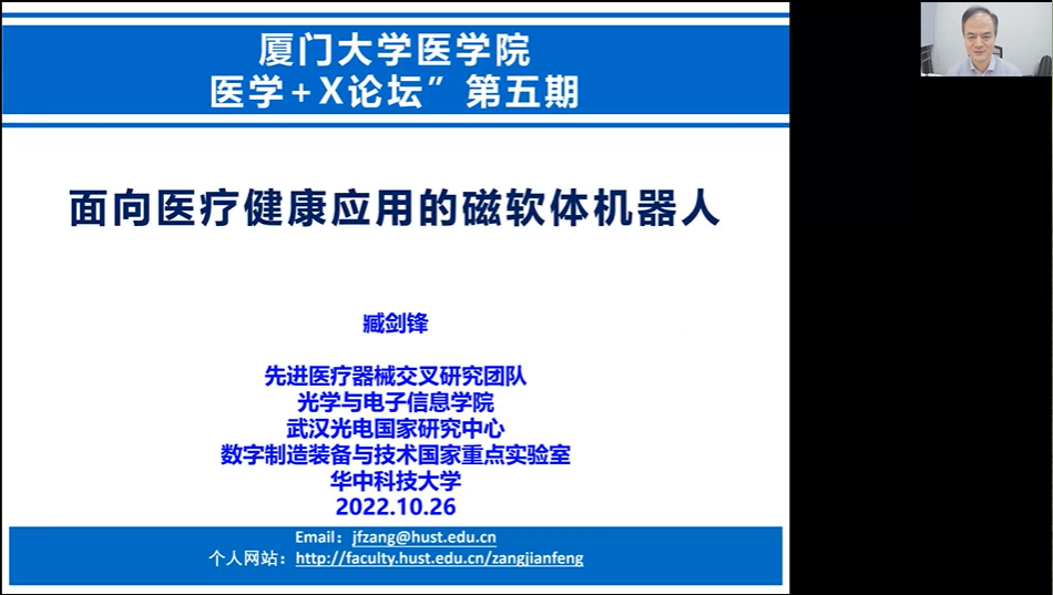 2022年10月26日,厦门大学-宝太生物“医学+X论坛”第五期在医学院成义楼102报告厅举行。此次论坛邀请了华中科技大学光学与电子信息学院的臧剑锋教授作报告,受疫情影响,会议采用线下+线上方式进行。会议由学院副院长李炜教授主持。