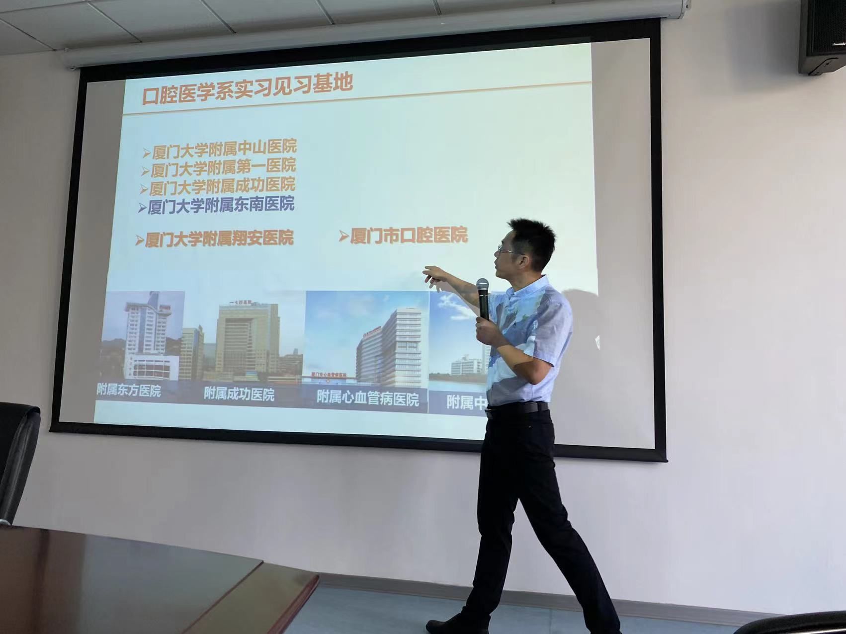 随后,口腔医学系专任教师陈勇副教授为新生们进行口腔医学系及口腔医学专业介绍。陈勇老师为同学们介绍了口腔医学专业过往背景、现有发展及未来前景,引导学生建立初步的专业认知。此外,陈勇老师向新生们介绍了口腔医学系的师资、教学配备及课程设置等,使同学们对口腔医学系有了大致了解。