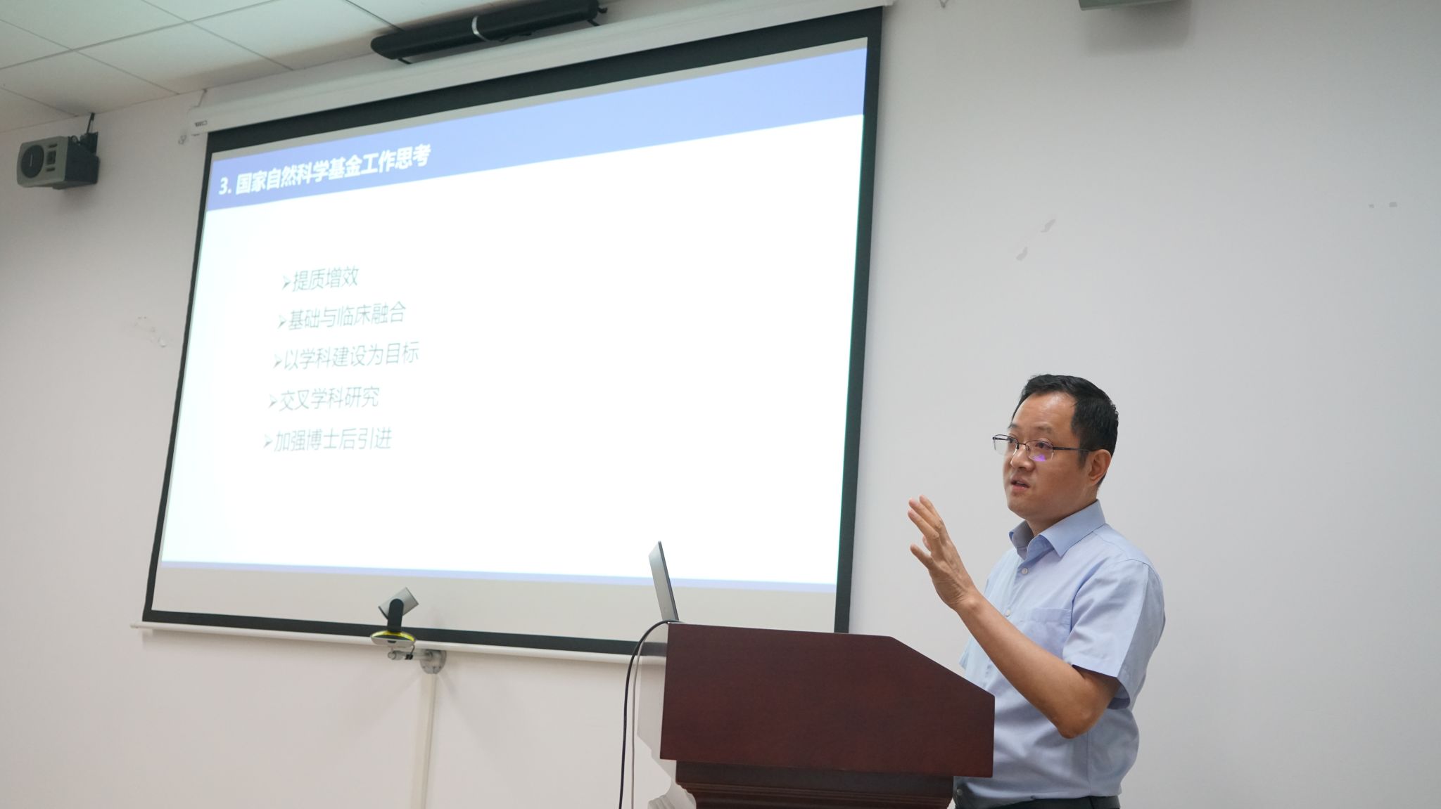 李炜副院长随后做了医学院科研情况报告。他根据近年来学院国家自然科学基金申报和资助情况,分析了当前学院科研基金申报存在的问题,从如何提质增效、加强基础与临床融合、加强学科建设、促进交叉学科研究、加强博士后引进等方面展开工作思考,提出实行精准扶持计划、推动临床学系建设纵深发展等工作举措,并计划以“医学+X论坛”、医学院学术年会为抓手,切实加强学术交流、促进基础与临床的融合,进一步实现资源共享、优势互补,共同提升附属医院的科研实力。