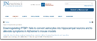 鉴于原位胶质细胞转分化为神经元在AD治疗方面的巨大潜力,厦门大学附属第一医院、厦门大学医学院神经科学研究所赵颖俊教授和许华曦教授团队尝试通过特异下调星形胶质细胞PTBP1诱导神经元转分化的策略来治疗AD模型小鼠。但事与愿违,通过星形胶质细胞高度特异表达的腺相关病毒(AAV)载体系统,该团队发现无论在生理条件或AD相关病理条件下敲低星形胶质细胞的PTBP1均不能诱导原位的星形胶质细胞转分化为神经元,并且无法挽救AD小鼠突触损伤和认知功能障碍的表型。相关研究成果以题为“Downregulating PTBP1 fails to convert astrocytes into hippocampal neurons and to alleviate symptoms in Alzheimer’s mouse models ”的重要(Noteworthy)研究论文于近日在线提前发表在神经科学领域经典期刊Journal of Neuroscience (美国神经科学学会会刊)上。
