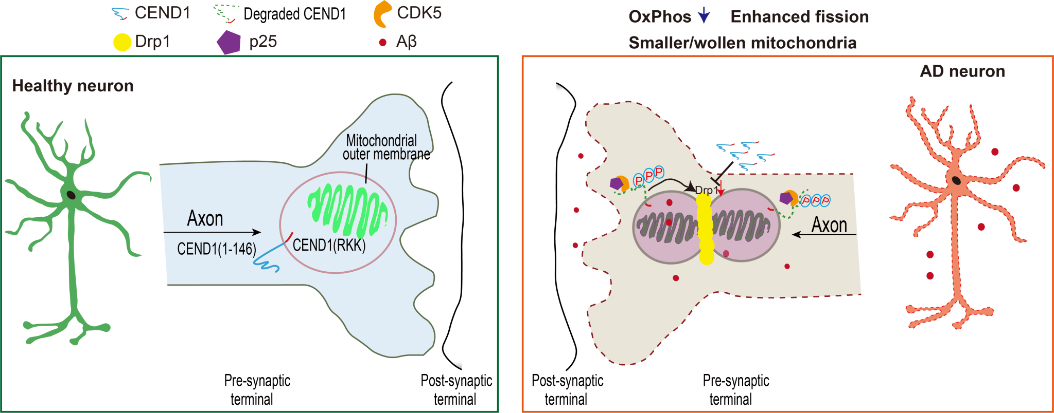 CEND1(Cell cycle exit and differentiation 1)在神经元发育及细胞周期调控中具有重要的作用。张杰教授团队长期从事神经退行性疾病过程中神经元细胞周期的异常激活调控机制。该项研究发现CEND1在神经元的突触前的线粒体的外膜特异定位(如下图),并在AD致病过程显著降低。CEND1不仅调控了线粒体的融合分裂,同时由于其特异的突触前定位的特点,对突触功能的维持也具有重要的作用,这为深入理解线粒体在调控突触功能和神经退行性病变中的机制提供了新的思路。