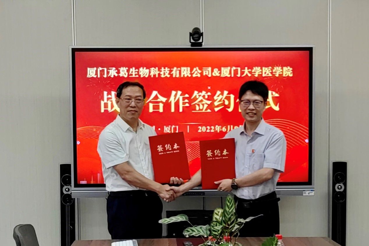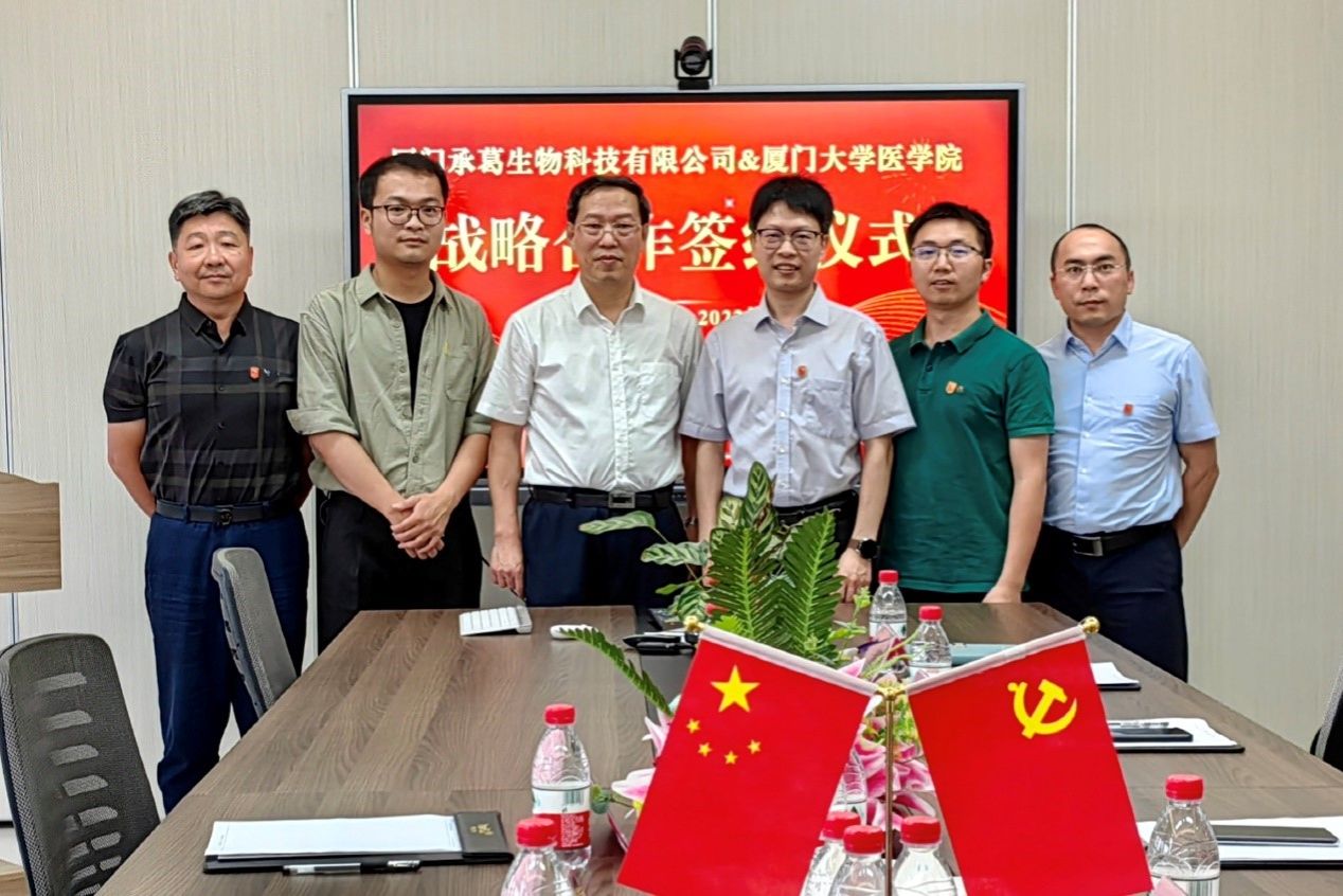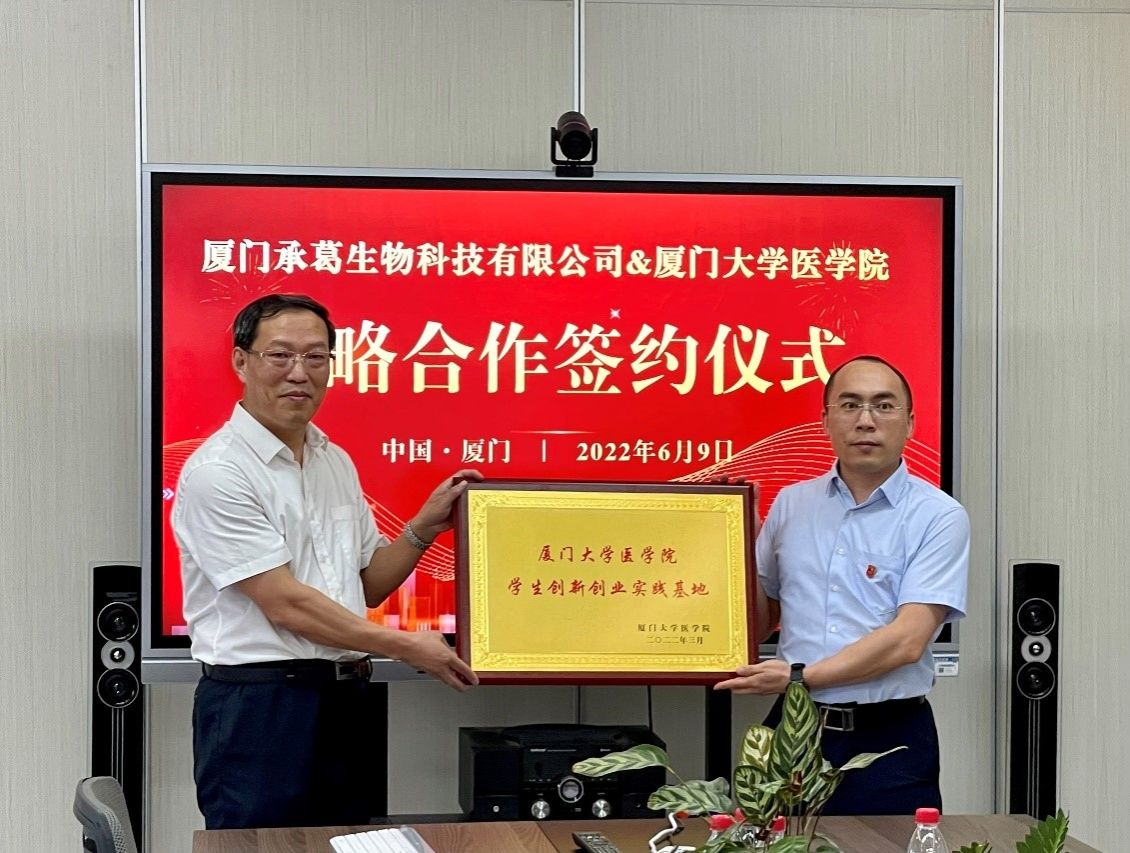 6月9日下午,厦门大学医学院与厦门承葛生物科技有限公司“创新创业实践基地”签约及授牌仪式成功举行。厦门大学医学院副院长李文岗、辅导员郑俊艺,厦门科技有限公司董事长肖传兴、首席技术官张帮周、首席行政官姚恩峰、医学检验实验室有限公司总裁梁银龙出席本次仪式。仪式由承葛生物总裁办主任李艳妹主持。