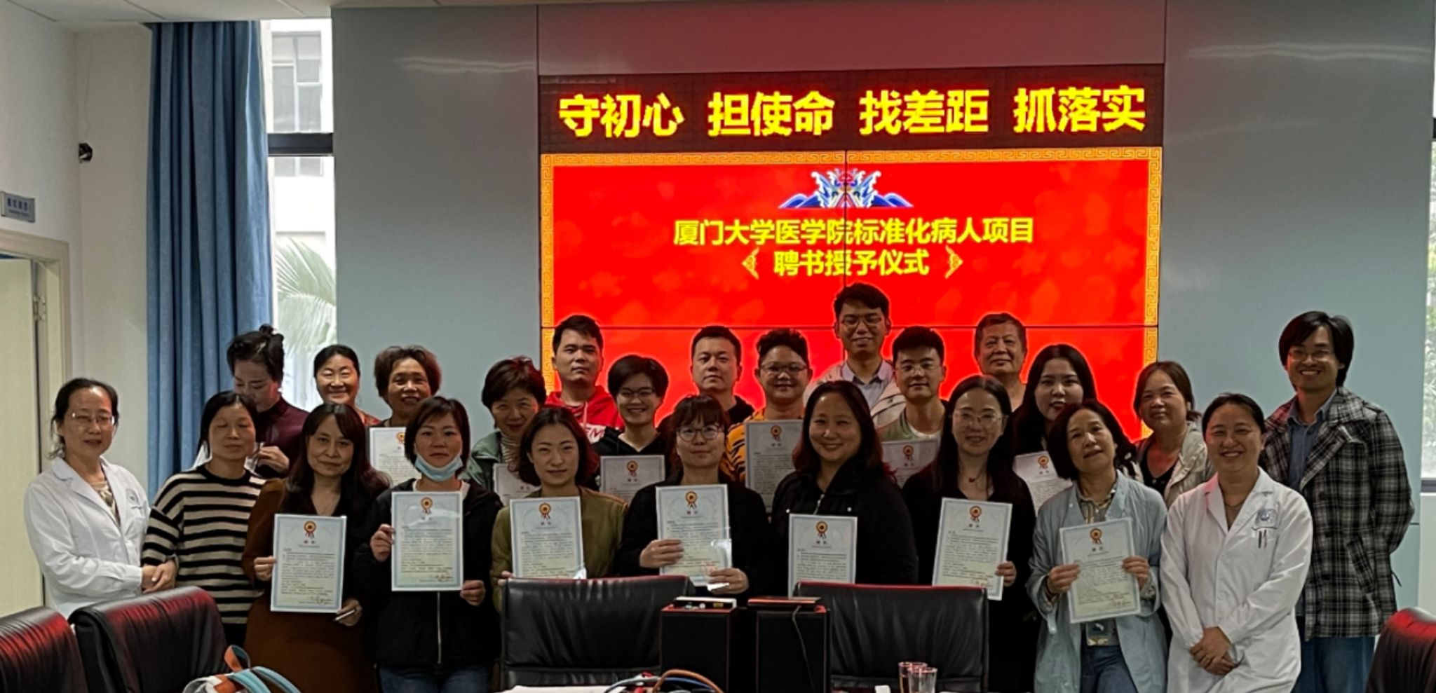 2022年5月28日,第四批24名面向社会招募的标准化病人(SP)志愿者成功完成全部面试,经过基础、记忆、表演、反馈等相关培训和考核后,拿到厦门大学医学院颁发的标准化病人聘书。他们将正式上岗,在问诊教学、课程考核以及临床专业和中医专业的国家水平测试考试之中作为医学生的“老师”和“考官”。