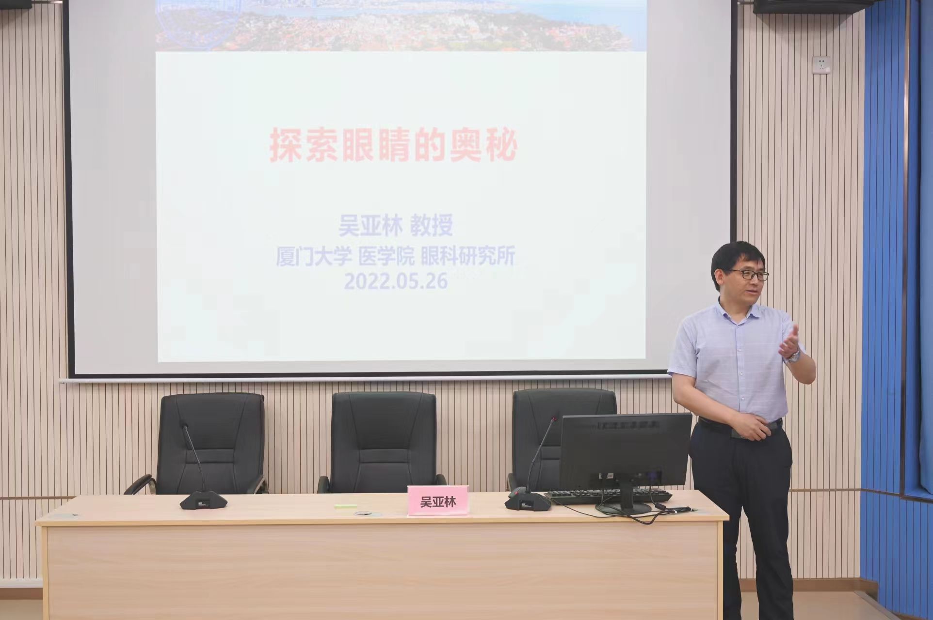 本次活动由同安一中副校长洪永灿同志主持。首先,眼科研究所吴亚林教授为同安一中的同学们做了题为“探索眼睛的奥秘”的科普讲座。吴教授从眼睛的结构讲到常见眼病,从近视的预防讲到科研的构思和设计,讲座中穿插了很多有趣的科学问题,同学们无不全神贯注、认真聆听。深入浅出的讲授,赢得了同学们热烈的掌声。接着,医学院教务办李晴主任进行了“建世界之大学 为吾国添异彩”的学院宣讲,介绍了我院的学科发展、专业特色、人才培养、招考分数等情况,为同学们未来报考提供了必要的参考资讯。