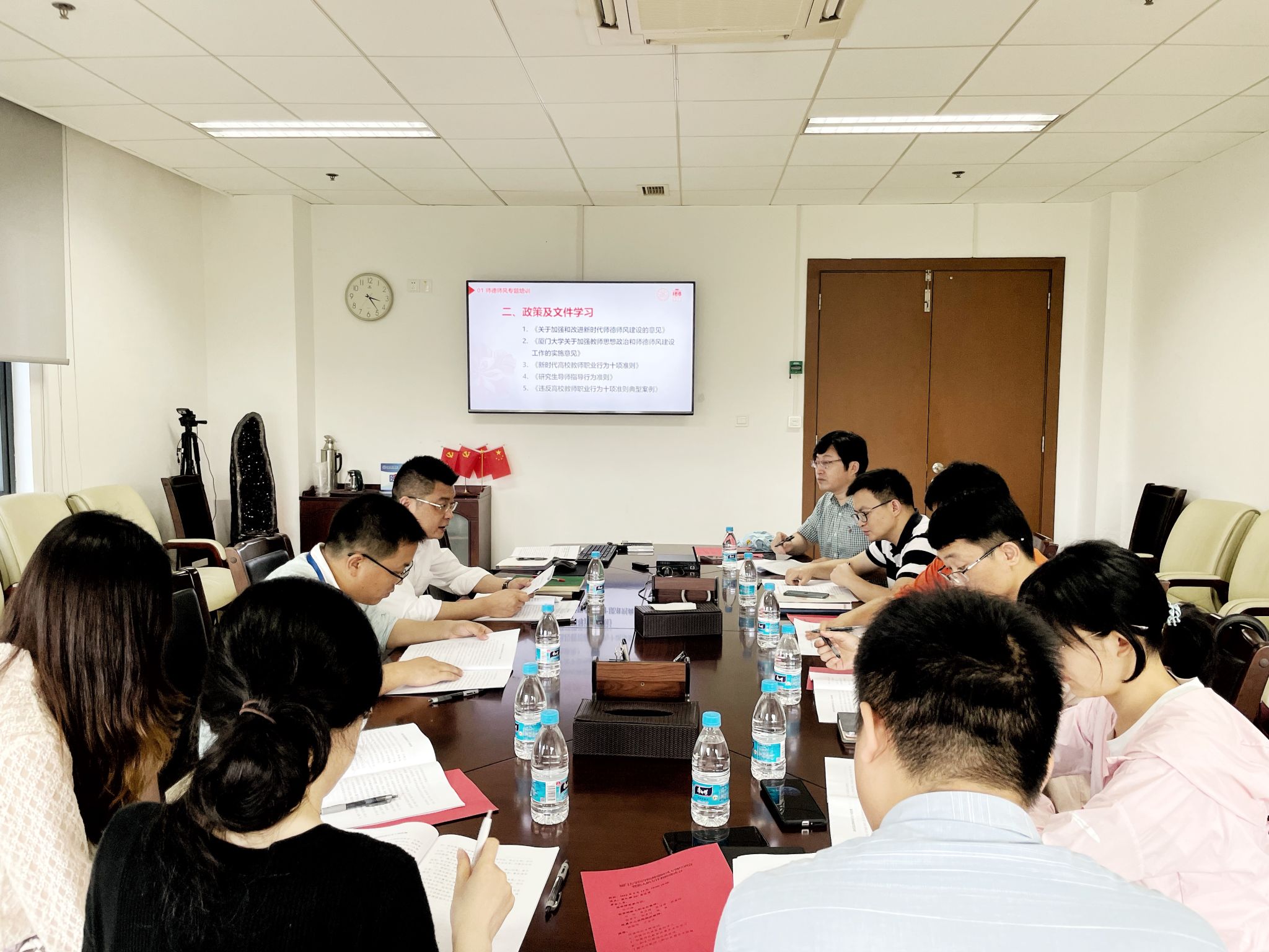 与会教师首先集体观看了“违反高校教师职业行为十项准则典型案例”视频资料,随后,陈怀锋带领与会教师集中学习了《关于加强和改进新时代师德师风建设的意见》、《厦门大学关于加强教师思想政治和师德师风建设工作的实施意见》、《新时代高校教师职业行为十项准则》、《研究生导师指导行为准则》等文件资料,并结合教育部公布的违反师德师风的典型案例对与会教师开展了一次警示教育。
