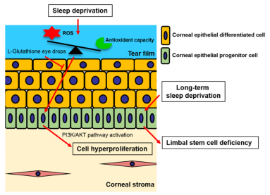 由于眼表暴露于外部环境,容易受到不良刺激因素影响,会产生氧自由基。正常泪液中含有很多抗氧化成分,可以对抗氧自由基,维持氧化和抗氧化的平衡。眼科研究所的这项研究发现,在睡眠不足情况下,泪液中过高的活性氧破坏了这种平衡,从而激活角膜上皮干细胞,导致角膜上皮干细胞过度增殖。
