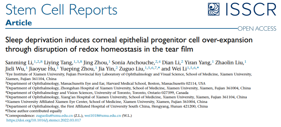 4月28日,医学院眼科研究所刘祖国教授和李炜教授团队在Cell出版社旗下的《Stem Cell Reports》杂志在线发表其最新研究成果 “Sleep Deprivation Induces Corneal Epithelial Progenitor Cell Over-Expansion through Disruption of Redox Homeostasis in the Tear Film”,揭示睡眠不足对角膜上皮干细胞的危害。