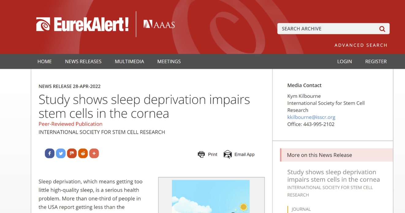 该研究发现,短期内的上皮细胞过度增殖对于机体来说可能是一种适应性的保护措施。而在经历2个月长期睡眠缺乏之后,小鼠出现角膜上皮干细胞缺乏,角膜透明度也明显下降。该研究给长期睡眠不足人群敲响了视力影响的警钟。