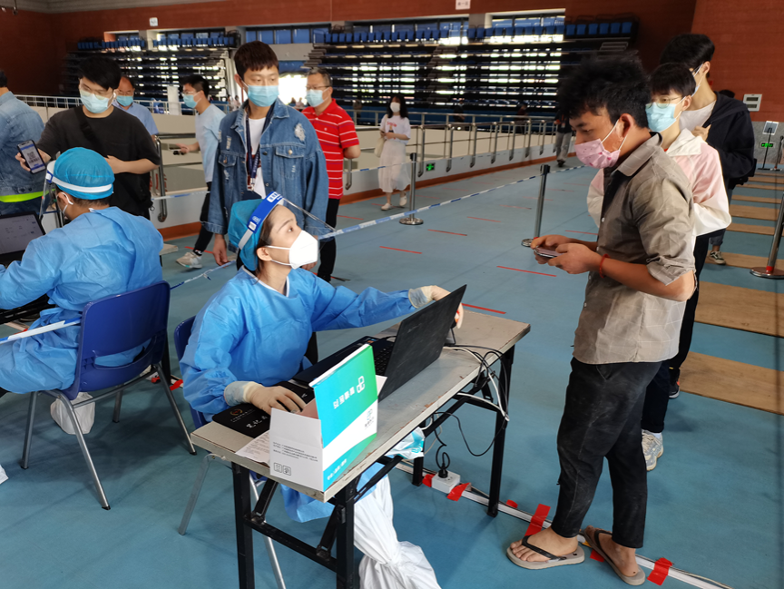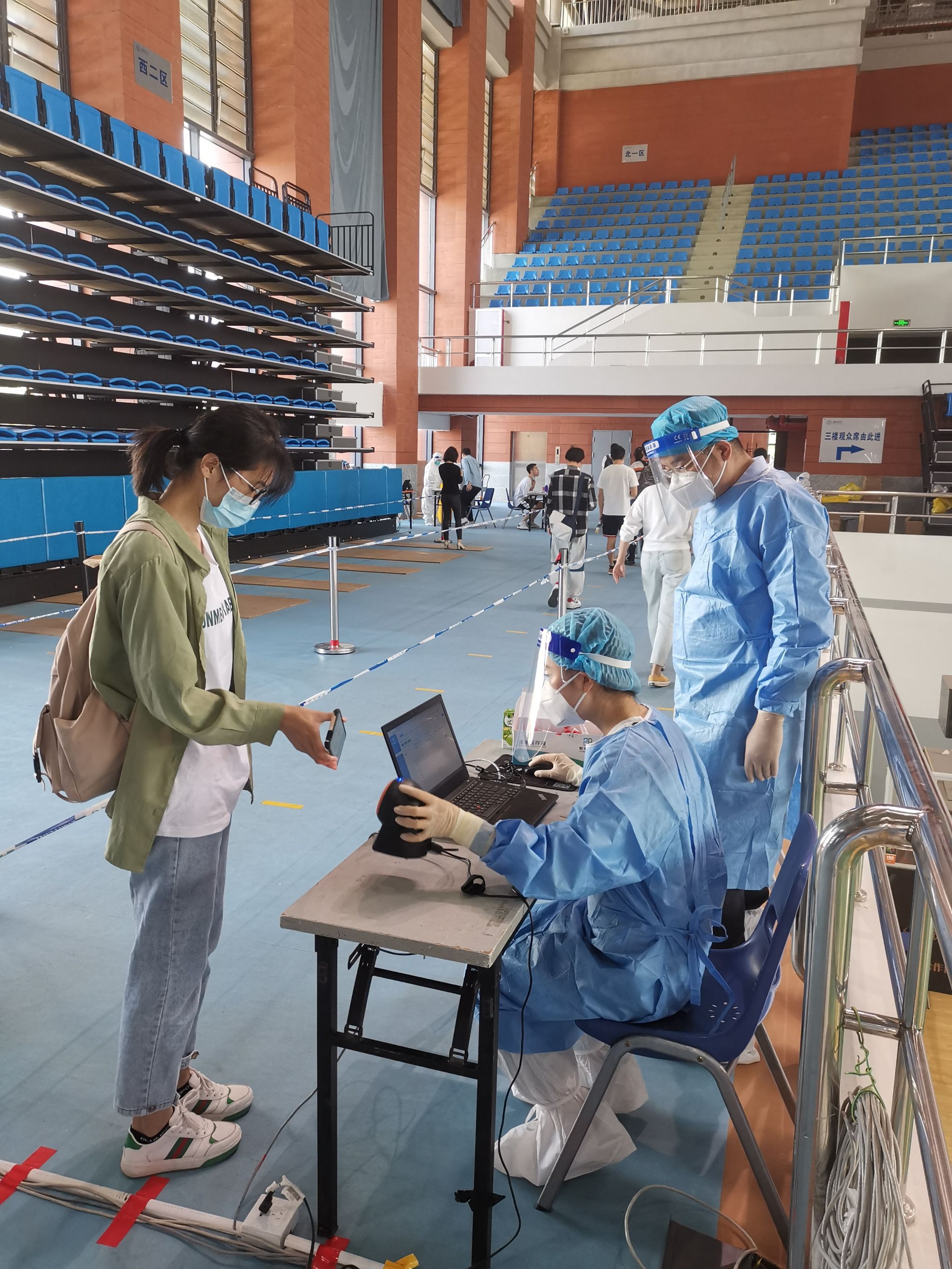 上午8:30,全体教工志愿者队伍在翔安校区体育馆参加了现场培训,按照防疫要求穿戴好全部装备后,迅速到岗到位,投入工作中。8名教工党员负责扫码检录,8名教工党员负责现场引导、维持秩序,2名教工党员负责核酸检测试管送检。