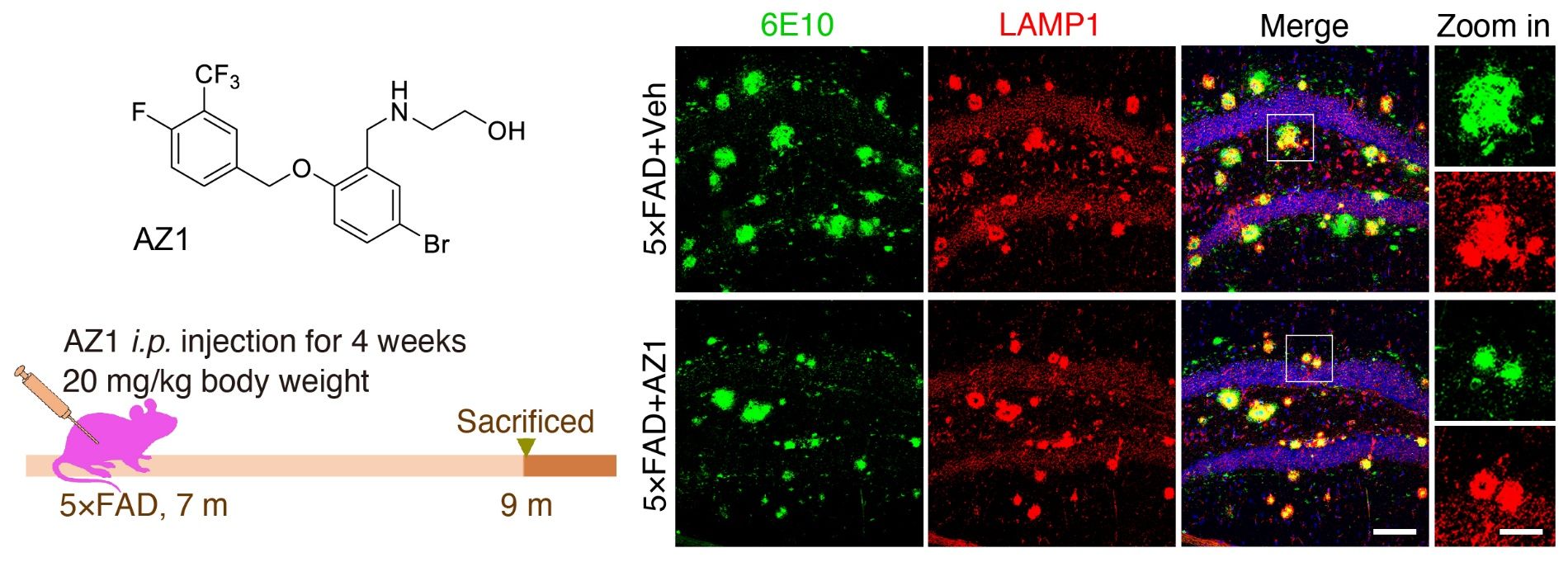 最后,研究团队发现给5×FAD小鼠注射USP25的小分子抑制剂AZ1可以显著减轻小鼠脑中淀粉样斑沉积,同时减少营养不良神经突起(Dystrophic neurites)的形成。该研究通过遗传学和药理学方法证明了21-三体与AD神经病理的关联性,指出USP25可能作为AD的潜在治疗靶点。