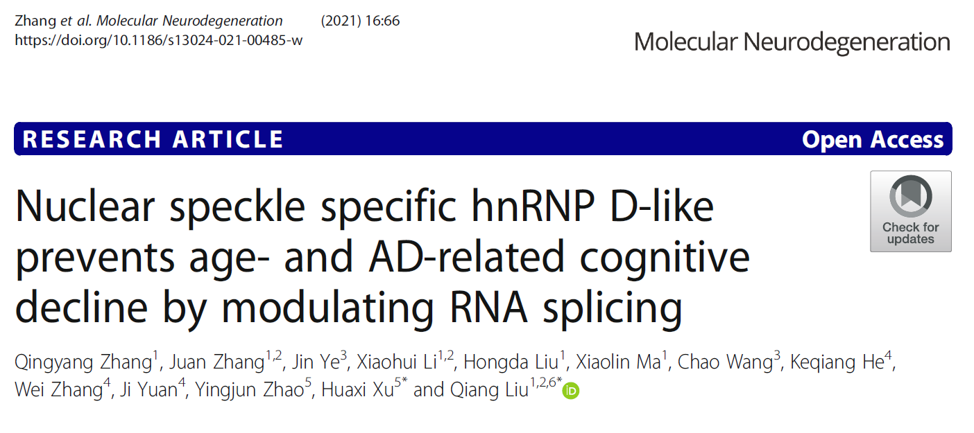 2021年9月23日,厦门大学医学院神经科学研究所许华曦教授团队和中国科学技术大学刘强教授团队在神经科学领域顶级杂志Molecular Neurodegeneration(IF 14.195)上联合发表研究论文“Nuclear speckle specific hnRNP D-Like prevents age- and AD-related cognitive decline by modulating RNA splicing”,文章揭示了RNA 结合蛋白hnRNP D-Like通过调控神经元的RNA选择性剪接过程参与调控大脑衰老以及阿尔茨海默病的全新机制。