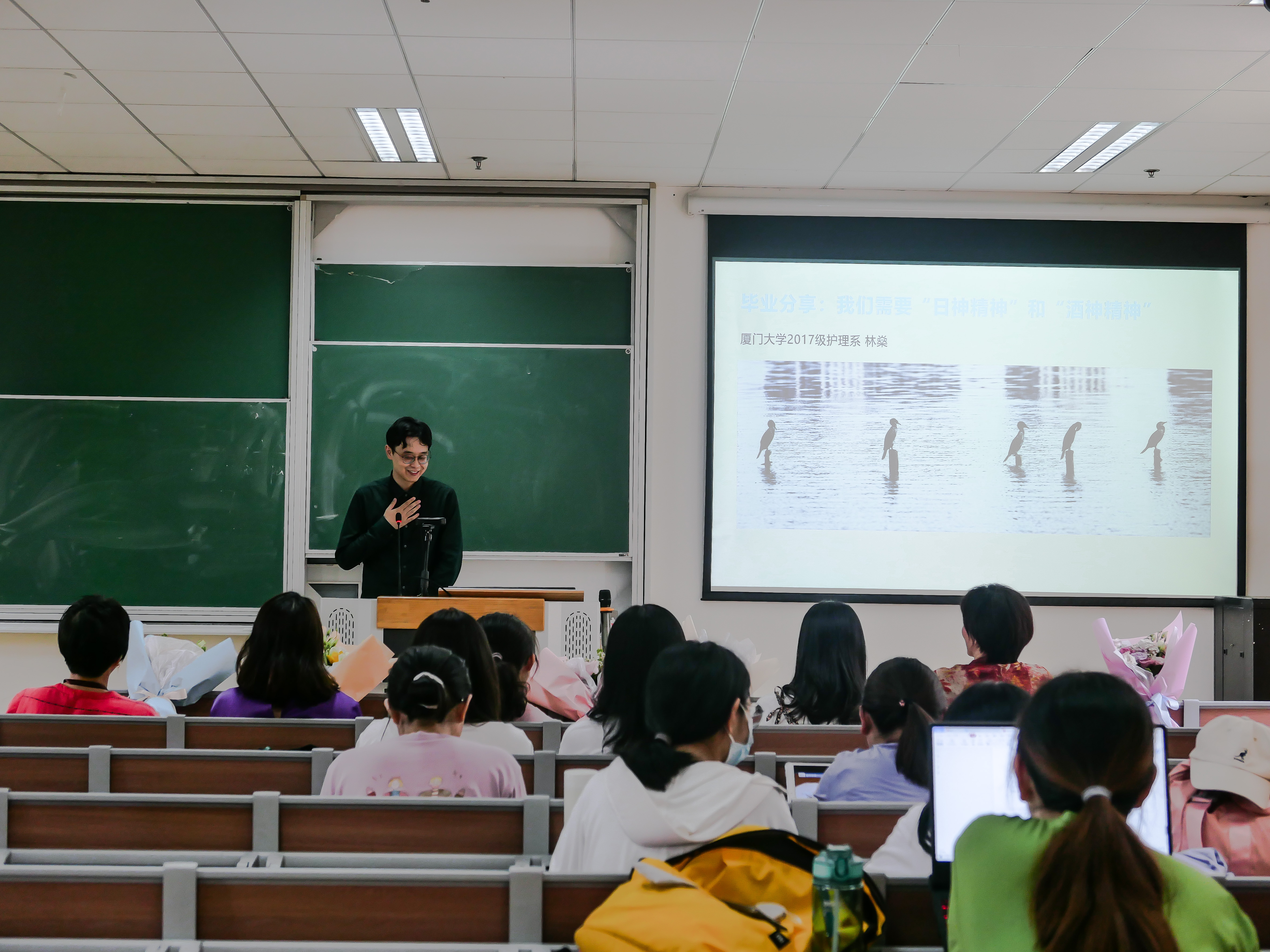 活动伊始,几位学生代表上台向老师们献花,表达对老师们四年来的悉心栽培、倾情付出的诚挚感谢。2017级护理班林燊、黄仲谋、郭艺嘉、马卓、戴玉梅、李啸哲、黄思嘉7位同学向2018级的同学们分享自己在保研、实习、科研、工作等方面的经验与感想。在干货满满、互动充分的分享与交流下,同学们满载收获。最后,许温洁老师向大家寄予美好的祝福与希望,她希望大家在踏入新的环境中能够保持好心态,认真踏实地做好每一件事情。刘洋老师希望大家能在这最后一段的本科生校园时光里,不留遗憾,去做一些自己想做却还未实现的事情。杨金秋老师在科研方面畅谈了自己的想法与心得,为同学们送上了真挚的祝愿。沈曲老师表示,与大家在一起的四年中,尤其是最后一年的论文指导是一个相互成长,教学互助的过程,希望大家在今后的人生中,学会爱自己、爱别人,承担责任、适应环境,努力成长为更好的自己。2017级护理班班主任朱杰敏回忆起四年前与大家的初次见面,细数过往,尽是不舍,她感言希望大家能够成为眼里有光,心里有爱的人。