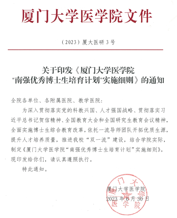 学院党委召开党委会会议,专题研究调研报告中提到的重点内容,推动形成1个文件和2个方案:《厦门大学医学院“南强优秀博士生培育计划”实施细则》;方案:《医学院专任教师岗位绩效考核评价实施细则(试行)》《医学院工程、实验等系列专业技术岗位绩效考核评价实施细则(试行)》。