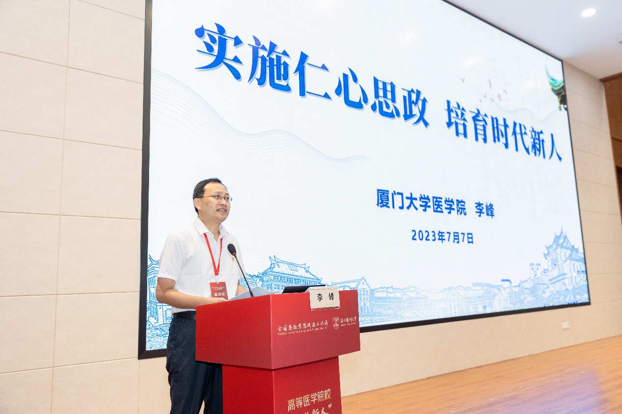 7月7日,高等医学院校“时代新人”培育工作研讨会在温州医科大学召开。会议由全国高校思想政治工作网主办、温州医科大学承办。来自43所高校的3000多名师生以线上线下相结合的方式参加会议。北京大学、上海交通大学、浙江大学和厦门大学等四所高校受邀围绕如何培养“时代新人”作主题分享。学院党委书记李峰在大会上作题为《实施仁心思政 培育时代新人》主题发言,全面展现学院“仁心思政”工程的探索与实践,并结合“加强政治引领、聚焦基层基础、打造品牌特色”为当前“时代新人”培育工作提出新思路。