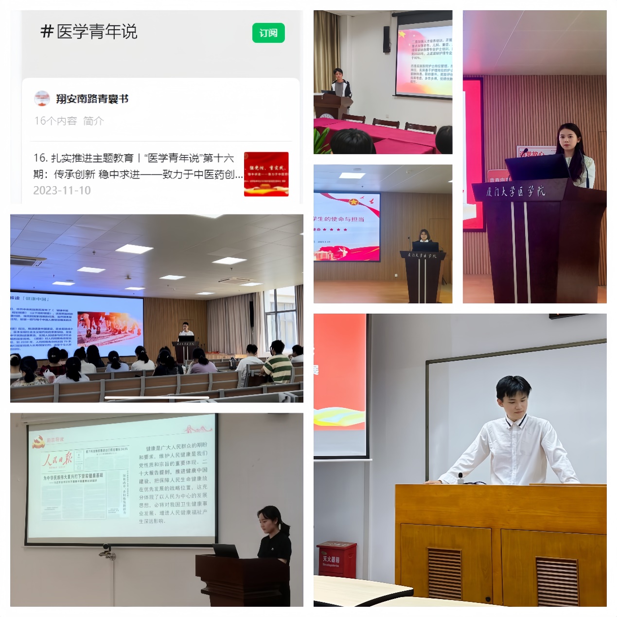 举办各类主题“大联赛”。举办主题微团课比赛、海峡两岸舌象知识邀请赛、“学海无涯 ‘医’路领先”厦门大学第十届“光前杯”医学知识竞赛、厦门大学第五届“拥抱阳光 守护成长”心理知识竞赛、首期“仁心言”研究生学术沙龙;组织学生代表队参加厦门大学2023年“福籽同心爱中华”主题宣讲比赛、“追梦党的二十大 勇踏新征程”固定党日+策划大赛、“大调研·小提案·深情怀”2023年厦门大学学生模拟提案大赛、“党的二十大和我的人生路”主题征文比赛,均获得优秀组织奖。